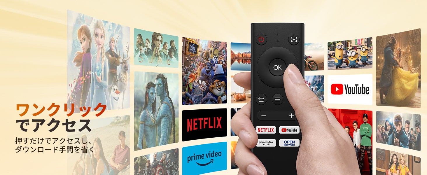 市販のLCDプロジェクターと違い、Aurzen D1プロジェクターはNetflix、YouTube、Prime Videoの公式アプリが内蔵され、Fire stick TVがなくても、ワンクリックでアクセス可能です。押すだけお気に入りの音楽、アニメ、映画、番組、スポーツの生中継やニュースなどをお楽しめられます。プロジェクターのリモコンが改良され、大きなサイズで操作しやすく、テレビのリモコンと遜色ない使い勝手を実現しました。