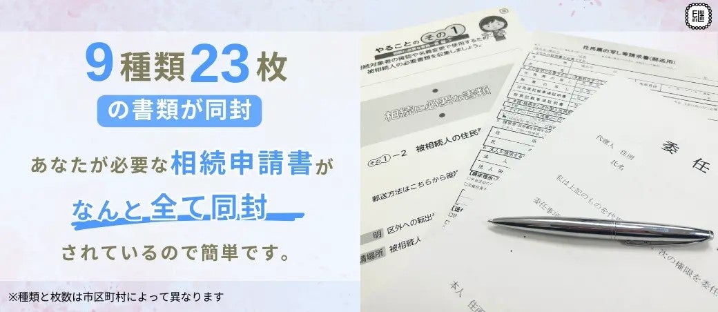 相続に必要な9種類23枚の申請書類や発送用封筒が同梱されているため、役所に足を運ぶことなく、申請書を記入して郵送することもできます。書類の一覧を確認しながら、漏れがないようにチェックリストで確認し作業を進められます。