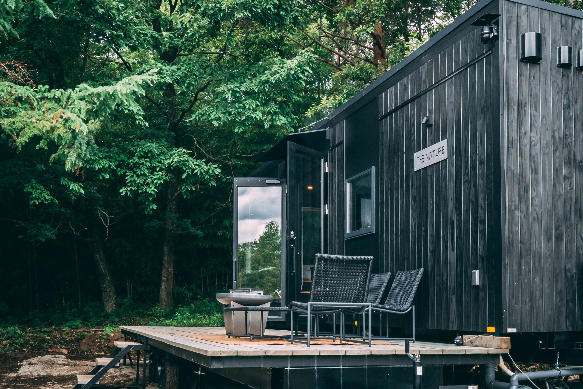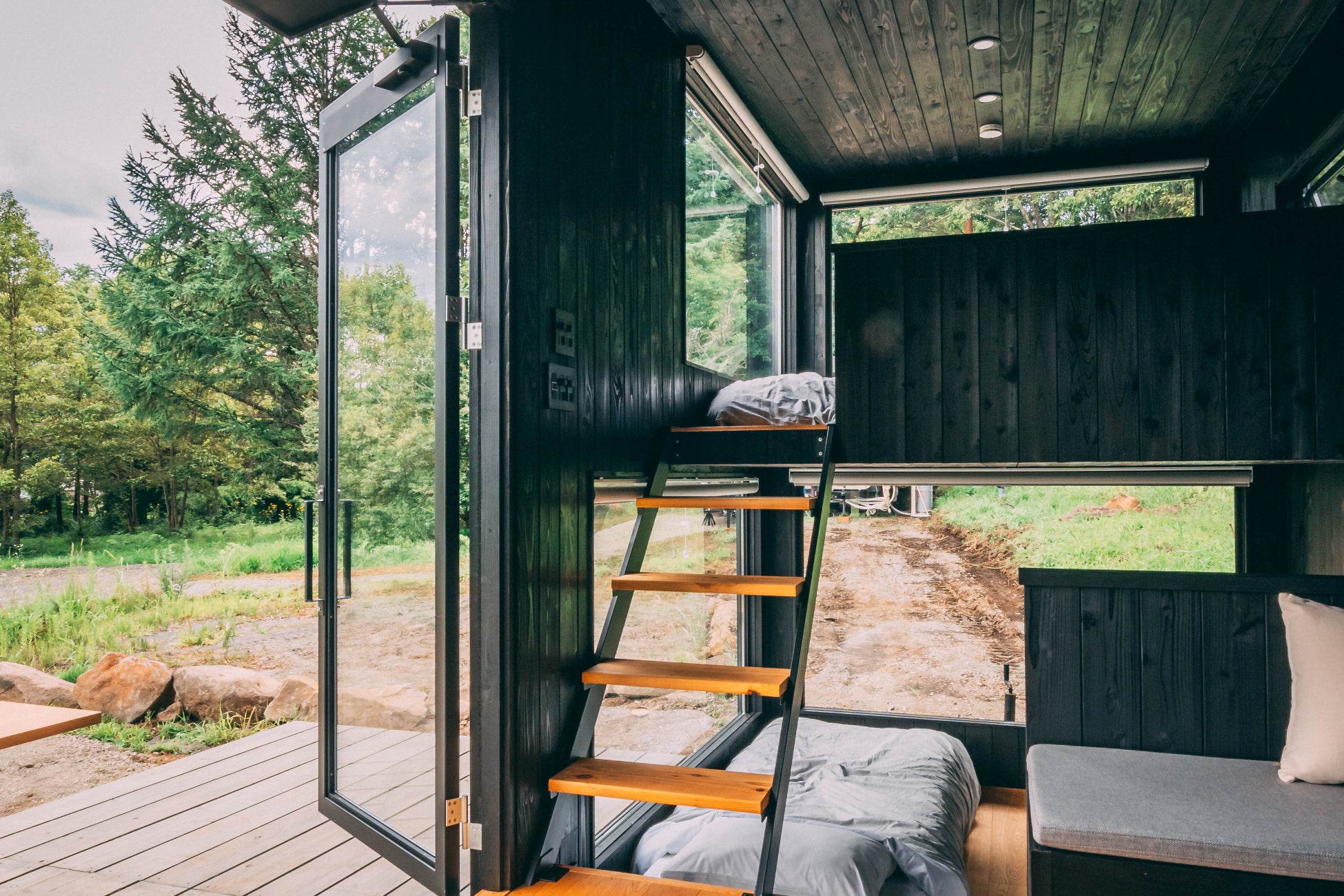 黒を基調としたスタイリッシュなボックス型のキャビン。自然の中で浮かぶ感覚の、巨大なガラス窓が2面に広がる主寝室や、大きく開くガラス扉からウッドテラスへ続く、インドア&アウトドアリビング。国産杉材をふんだんに用いたナチュラルな室内。自然の中に溶けこんでいくTHE NATURE体験を楽しめます。