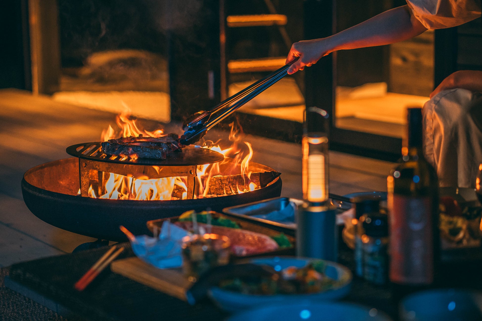 THE NATURE八ヶ岳では、自然の時間軸に合わせて、お好きな時間とスタイルで、ご自身で調理が楽しめます。キャビン内には、大型冷蔵庫や冷凍庫、最新の調理家電や調理道具、食器やカトラリーが完備。焚火台兼バーベキューグリルを備えたウッドテラスでは、自然の恵みと醍醐味を堪能できる調理体験も可能です。また、キッチンには「THE NATURE デリ」(美味しく手軽に楽しめるミール)のほかに、淹れたてのコーヒーが楽しめるキット、地元産のクラフトビールやナチュラルワイン(有料)を取り揃えています。