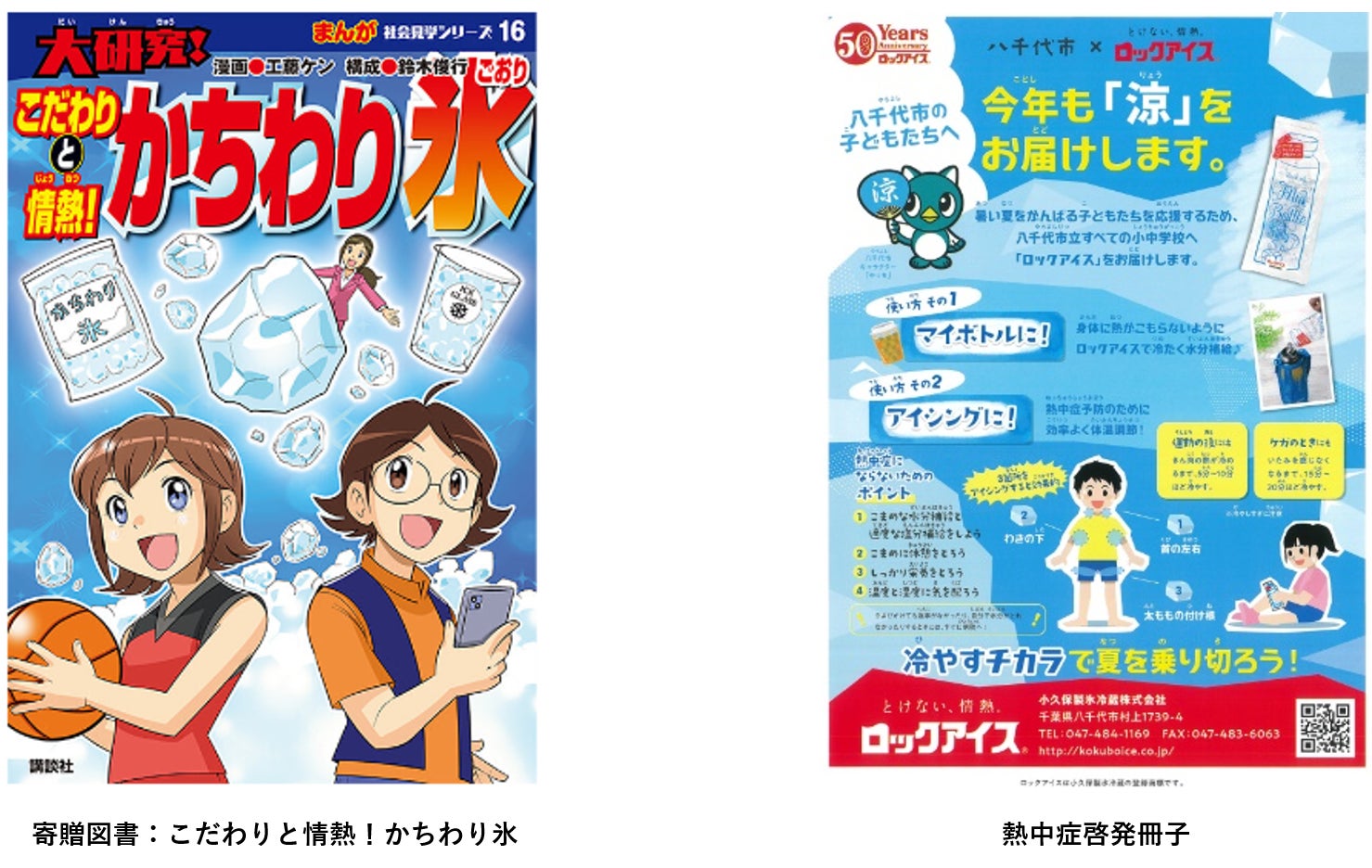 KOKUBOグループは、ロックアイスの「冷やすチカラ」で社会貢献活動を実施しています。千葉県の中学校を対象とした交流授業の実施や全国の小学校への書籍の寄贈、また熱中症対策を啓発する冊子の配布をしています。また八千代市内の小学校・中学校にロックアイスを提供し、夏場の熱中症対策に活用頂いています。
