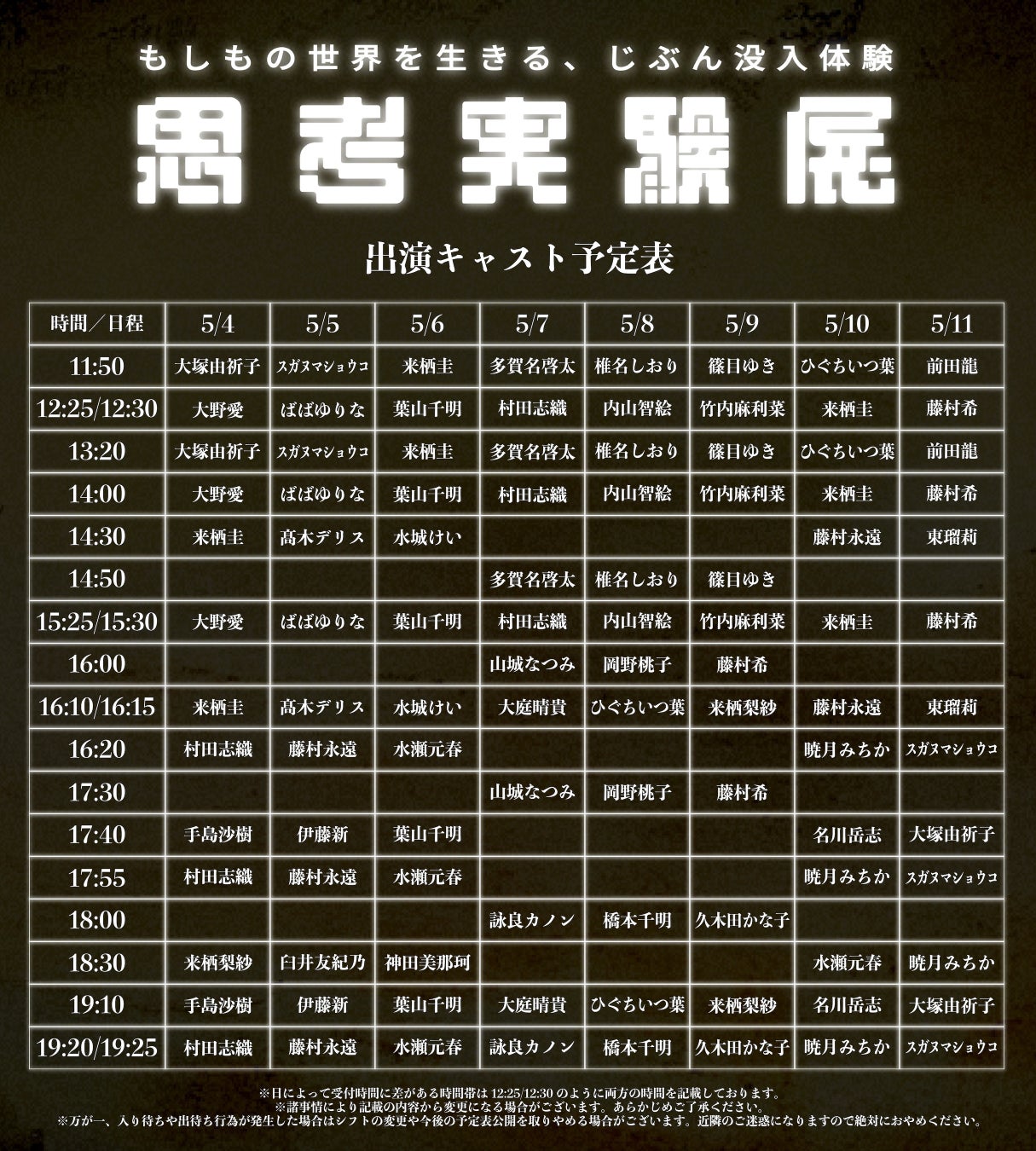 また、本日から一般会期(5月4日〜5月29日)チケットの販売が開始となります。それに伴い、体験者に付き添う重要な役目を担う、出演キャストの予定表(〜5月11日)も発表されました。1時間程度の体験時間でお立ち寄りいただけますので、GW期間のお出かけ先のひとつとしてぜひご検討ください!