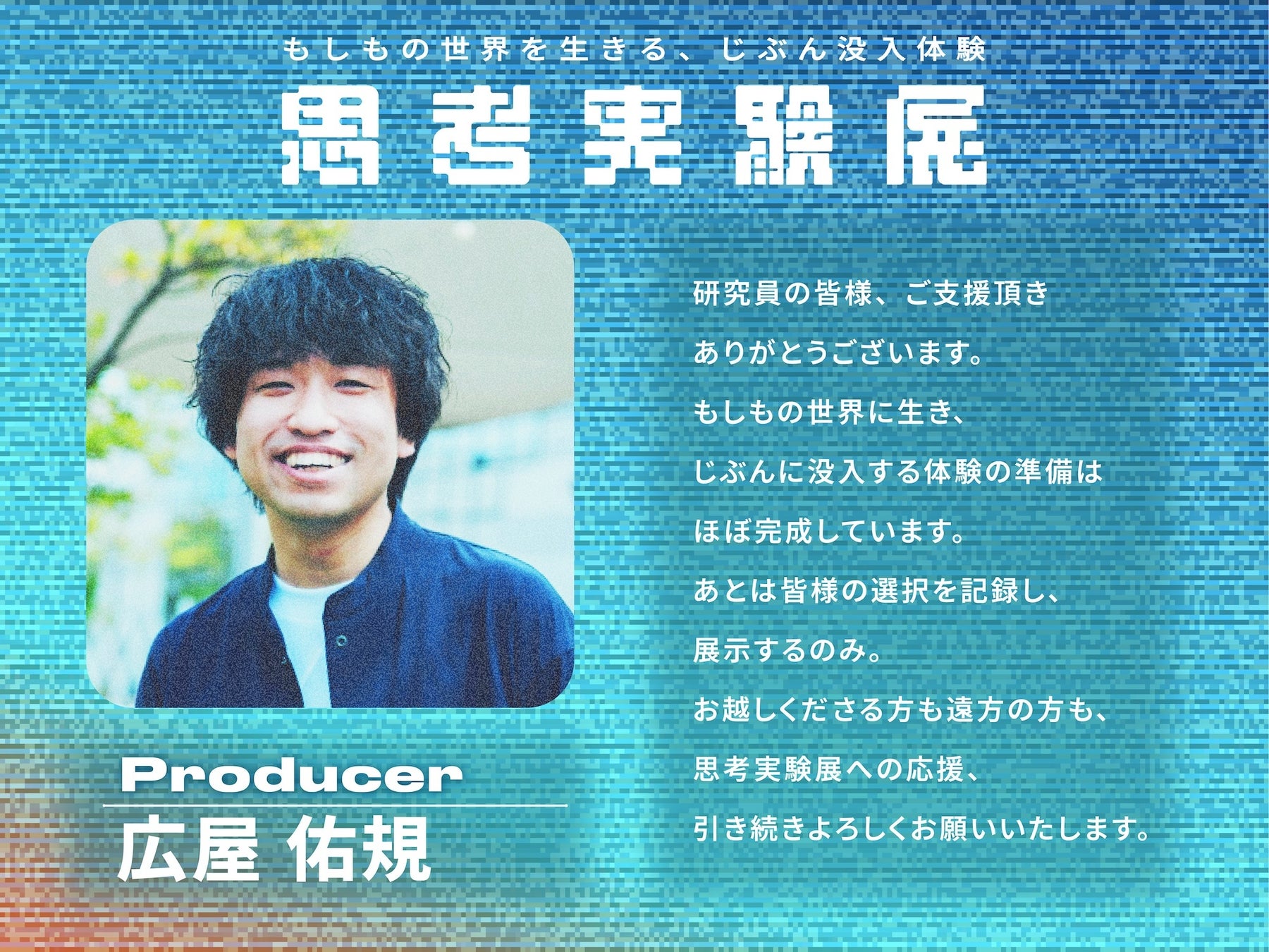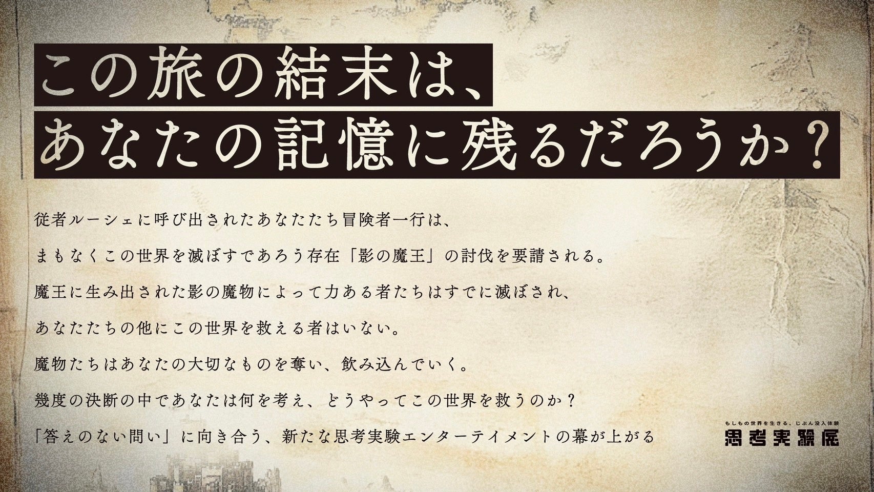 『思考実験展』は「もしも別の世界に行けたなら、あなたはどう生きるのか?」その思考を実験していく、新たな"じぶん没入体験"エンターテインメントです。ある物語の中に入り、その世界のルールに従いながら様々な選択を重ねることで、あなたの大切なものがむきだしになってゆく――そんな知らないじぶんに出会うための体験を、TRPGの名作シナリオ「カタシロ」の作者である驚天動地倶楽部のディズムと、体験型エンタメを手掛ける新鋭NOMOREInc. CCO広屋佑規がタッグを組みリアルイベントとして開催します。