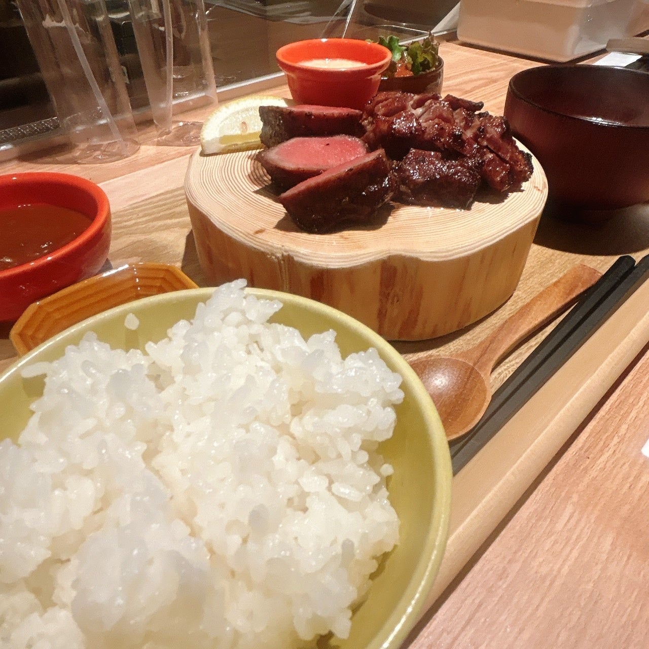 「牛たんの檸檬」で一番人気の【名物『極み』厚切り牛たん焼定食】は、牛一頭から一人前しか取れないという希少部位「たん元」を極厚切りにし、熟練の職人が炭火で丁寧に焼き上げます。牛たんのカット面を見せる盛り付けは、絶妙な火入れが実現できている証拠。丸太の上に並ぶ美しいレア感のある断面は食欲をそそり、見た目にもインパクトがあります。ステーキのように分厚くカットされた牛たんは、箸で感じるずっしりとした重みと、ぷりっとした弾力のある柔らかさが特長。咀嚼するごとにジューシーな旨みが口いっぱいに広がります。