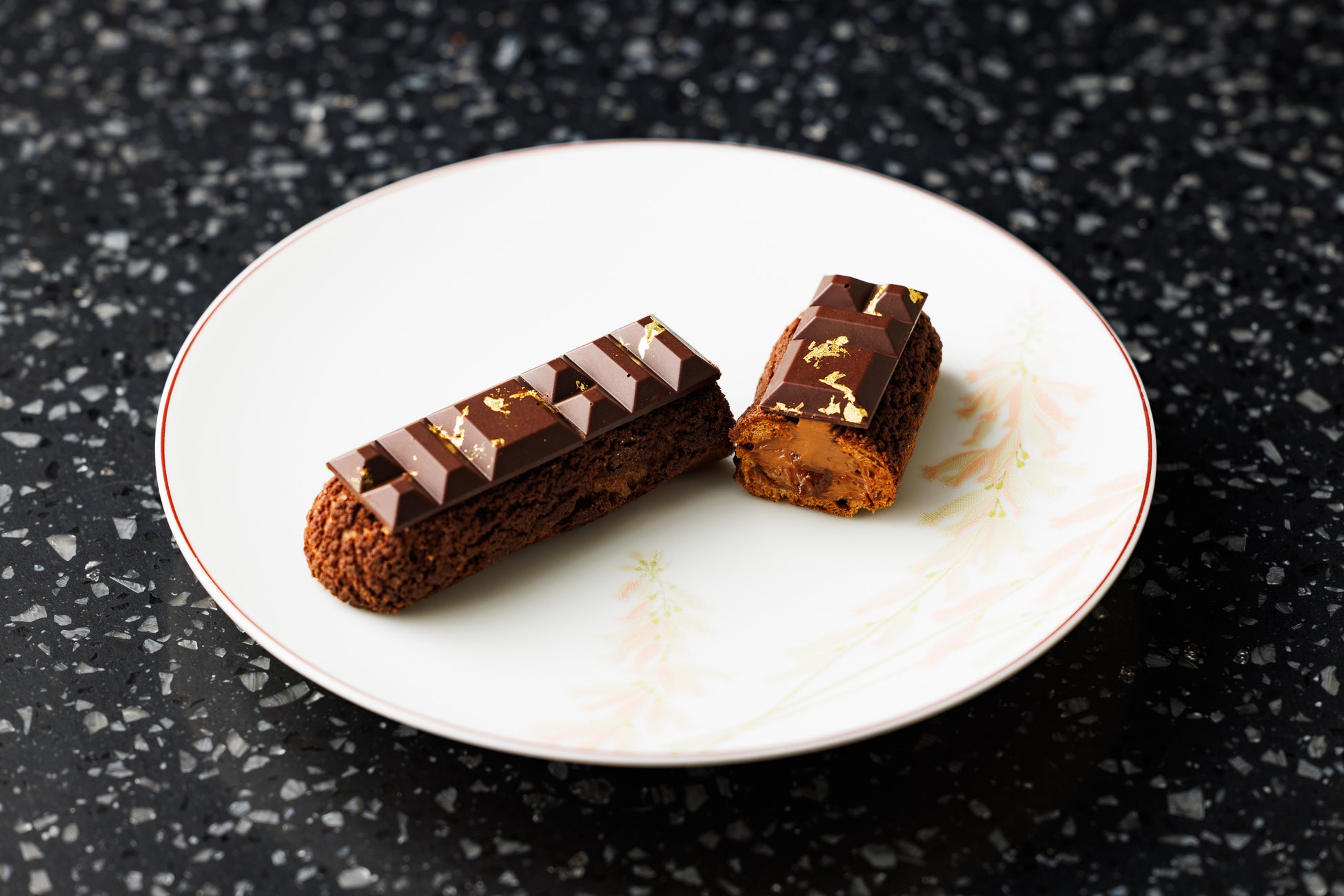 サクサクのショコラクランブルをまとったシュー生地に、赤いフルーツのような酸味が特徴のマダガスカル産カカオ75%のショコラのクリームとへーゼルナッツとカカオニブのプラリネを詰めた、カカオ感とプラリネの香ばしさを楽しめるエクレアです。トップには、ショコラ ノワールのバーに金箔をつけ華やかに仕上げました。