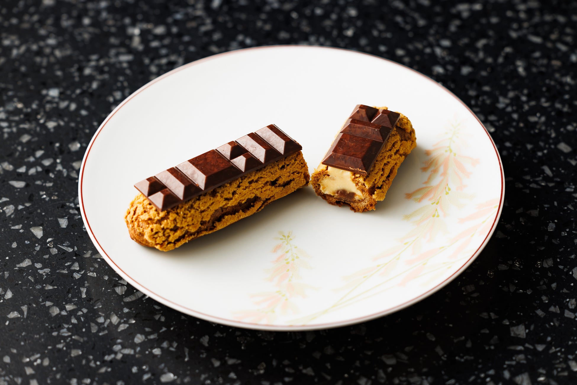 サクサクのクランブルと一緒に焼き上げたシュー生地に、マスカルポーネのクリームとゲランドの塩でアクセントを効かせたキャラメルをたっぷり詰め込んだエクレア。仕上げにはカリッとした食感を楽しめる、マーブルデザイン(ショコラ オ・レ、ショコラ ノワール)のショコラバーをトッピング。ほろ苦いショコラと塩キャラメルが相性抜群の一品です。