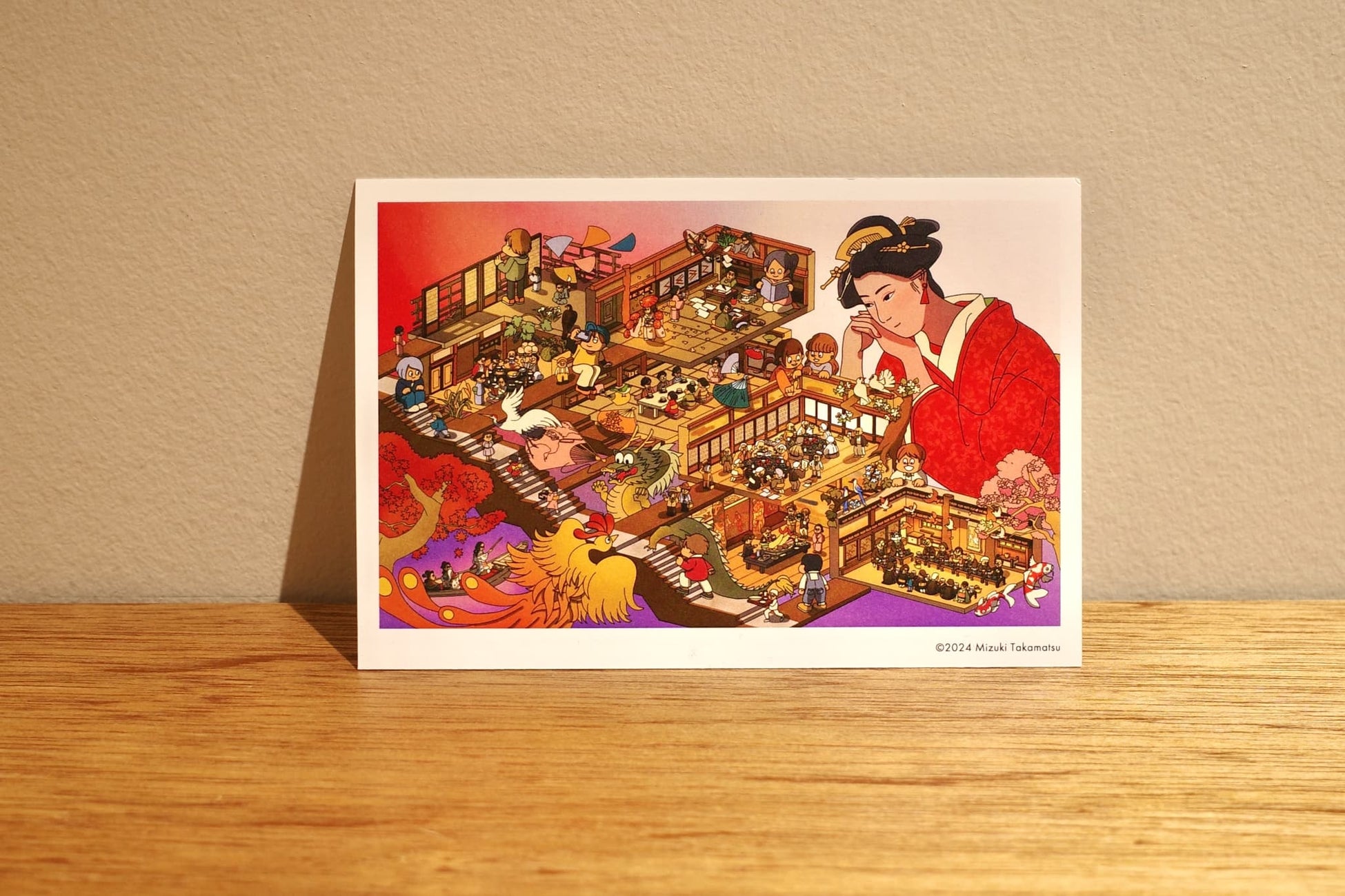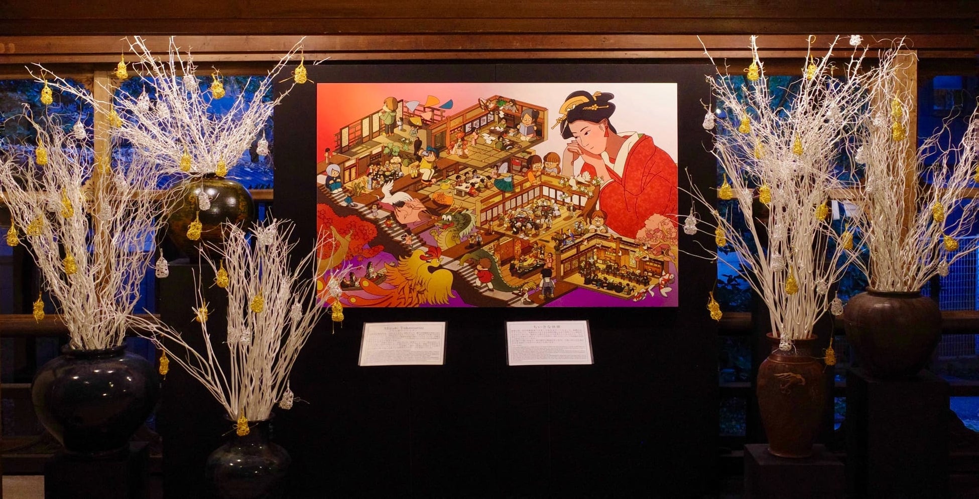 本作品は、ホテル雅叙園東京史上初(※3)となる、文化財「百段階段」の約90年におよぶ歴史に息づく物語や逸話をミニチュアのような密度の高い1枚絵として表現しています。作品デザインをあしらったポストカードやクリアファイルといった関連グッズの配布・販売も予定されています。2024年12月7日(土)から2025年1月12日(日)の期間(※4)で開催中の「百段百景〜あこがれの竜宮城〜」では、本展の告知をかねて本作品が先行展示(※5)されています。