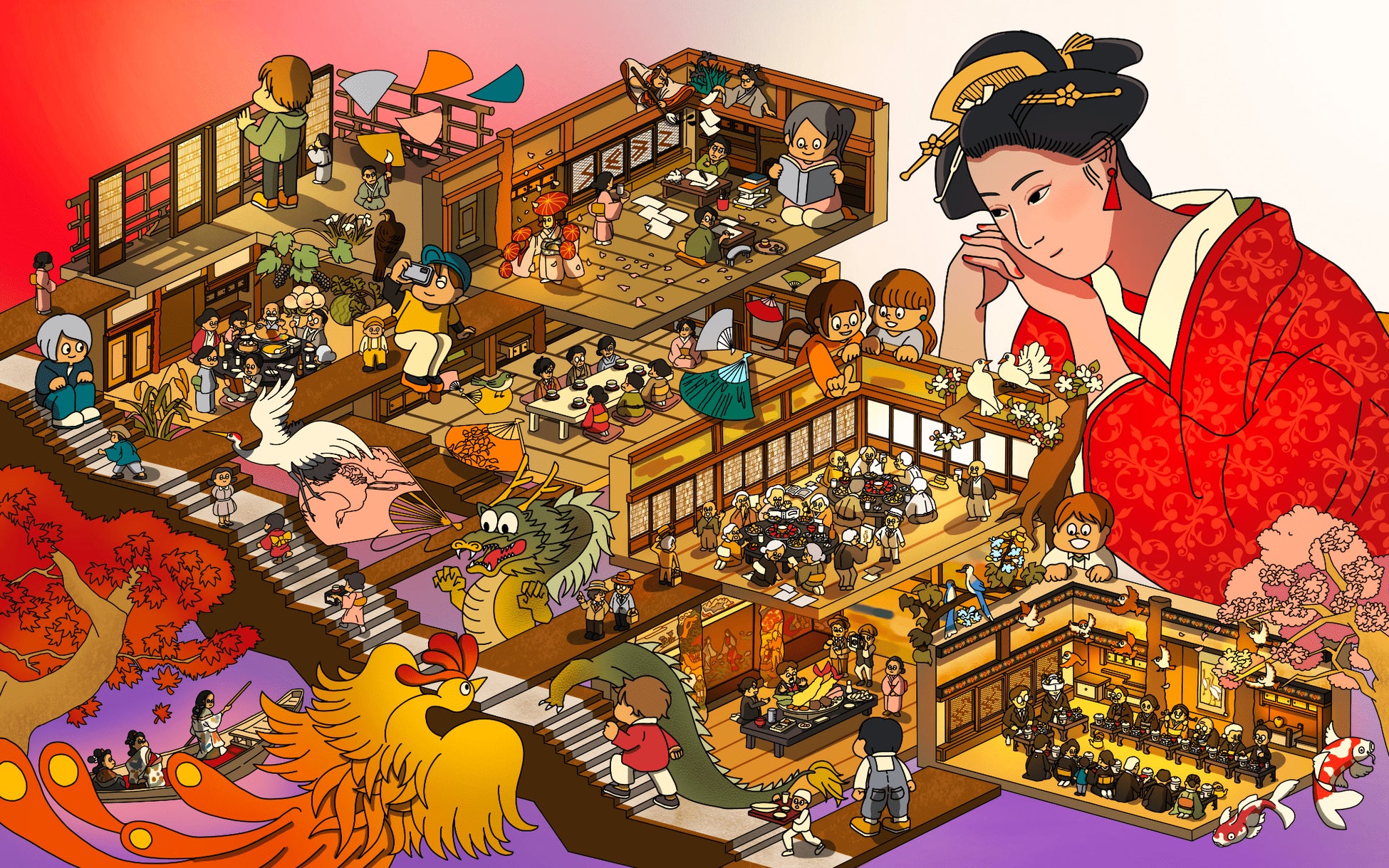 本作品は、文化財「百段階段」の各部屋に息づく物語や逸話、室内に施された歴史ある貴重な装飾をモチーフに、人々が過去の時代をミニチュアのように眺めながらその時代に想いを馳せる様子を、全10エリア・総勢98体のキャラクターが織りなす高密度で情報量の多い「ごちゃ絵アート」として表現しています。