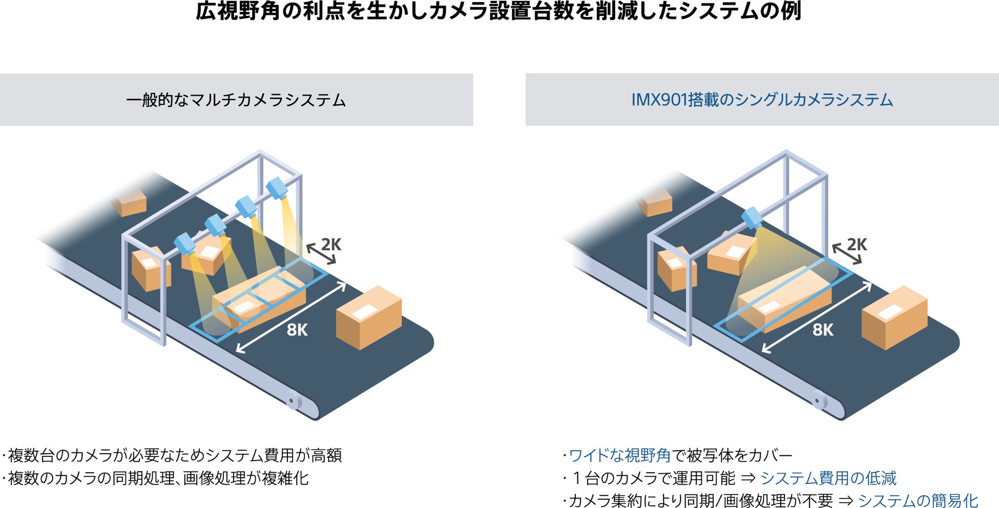 昨今の物流システムにおいて、ベルトコンベア幅の拡張や高速化が進む中、荷物のコードリーディングにおける撮像域の拡大や、撮影性能と効率の向上に貢献可能なイメージセンサーが求められています。一般的に、ベルトコンベア全体を画角に収めるためのシステムは、複数のカメラで構成する必要が