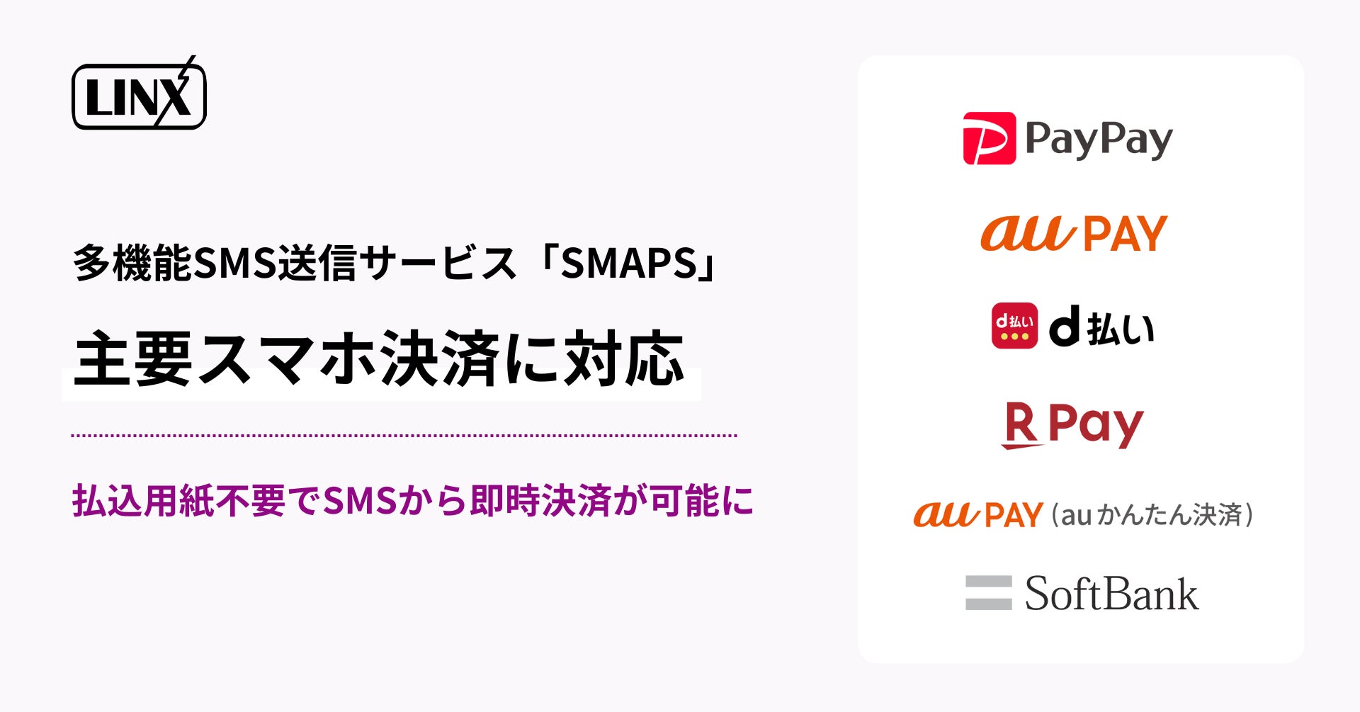 株式会社リンクス(本社:東京都千代田区、代表取締役:野田 貴、以下「リンクス」)は多機能SMS送信サービス「SMAPS」に、新たにスマホ決済(PayPay・au PAY・d払い、楽天ペイ、auかんたん決済、ソフトバンクまとめて支払い)ができる機能を追加しました。