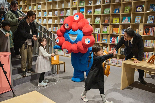 読み聞かせ終了後には、長崎から来てくれたハウステンボスのミッフィーと大阪・関西万博公式キャラクターのミャクミャクがサプライズ登場。参加し頂いた親子にプレゼントを手渡した。
