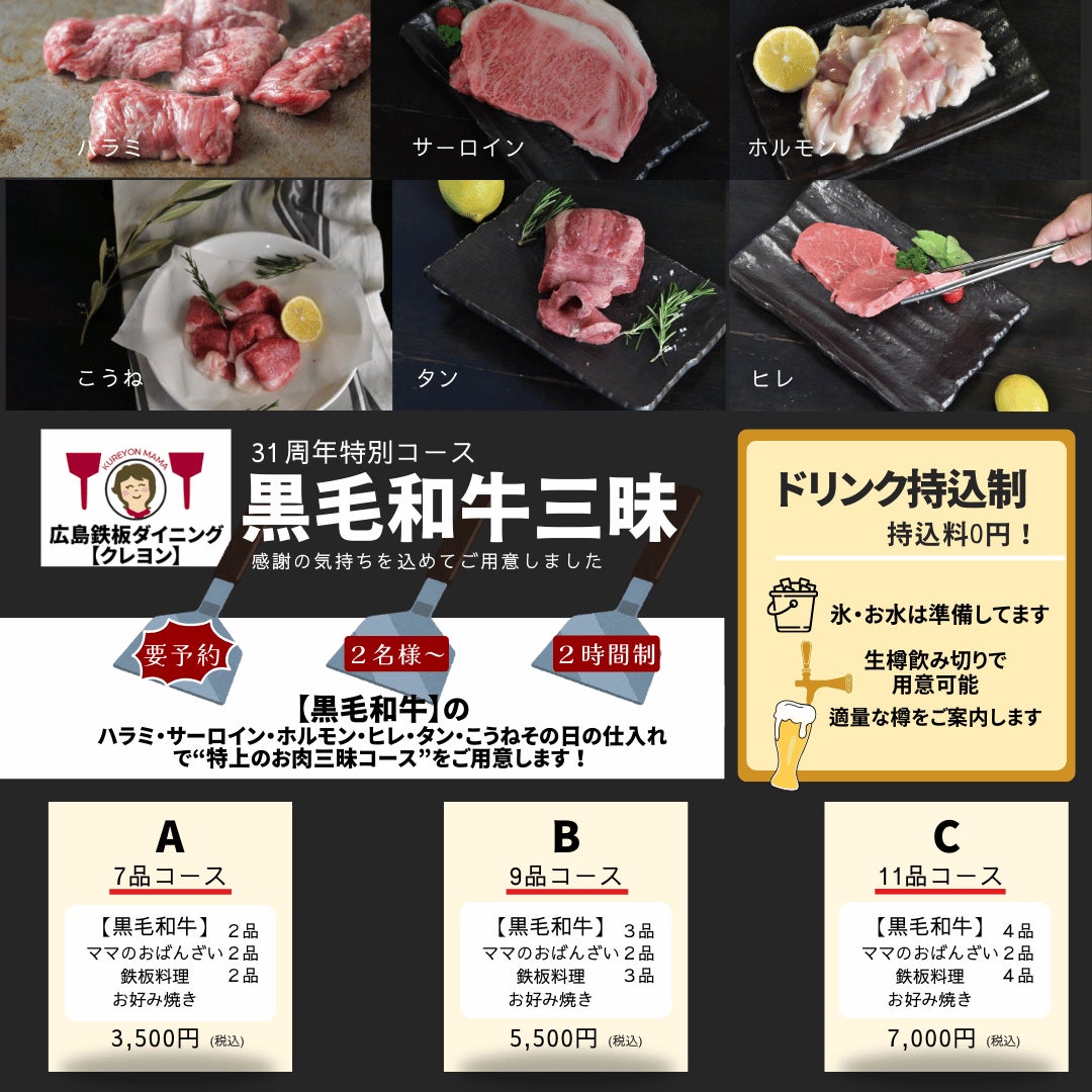 広島のお好み焼き屋でありながら、黒毛和牛が美味しいお店です。31周年を記念した特別なコースを提供中です。その日の仕入れによって変わる特上の黒毛和牛をお楽しみ下さい!