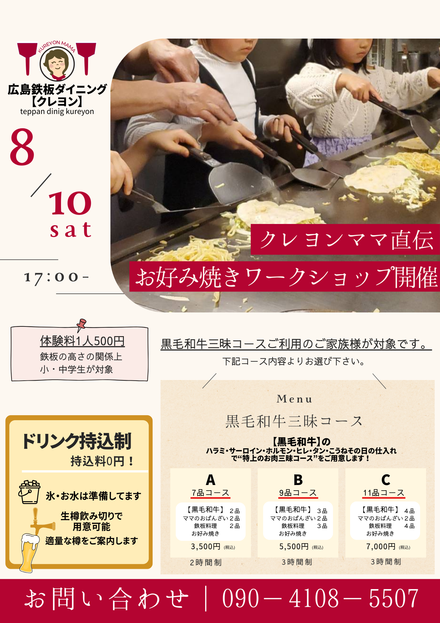 【広島鉄板ダイニング クレヨン】(店舗:広島県広島市西区小河内町/代表:清水智子)は、この夏8月10日(土)の1日限り【広島のお好み焼き】を教わることが出来るワークショップを開催いたします。