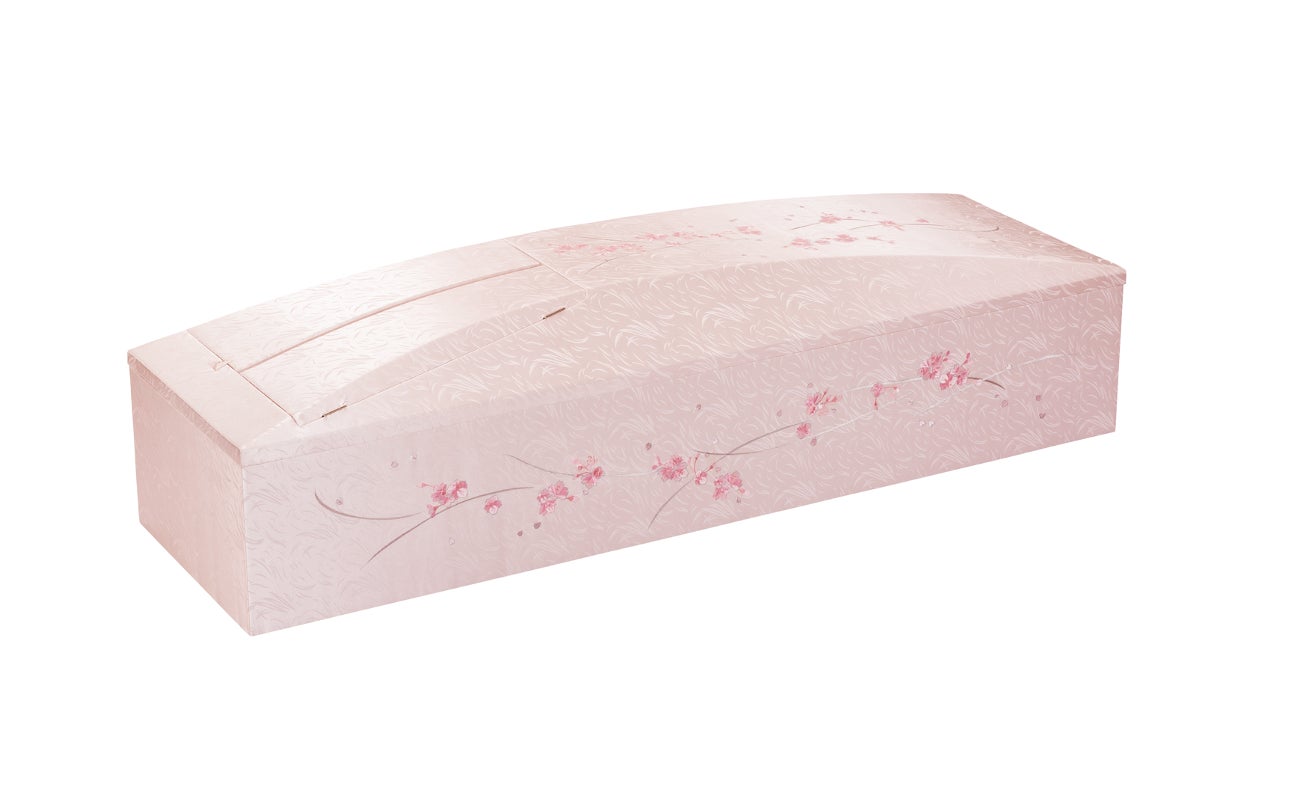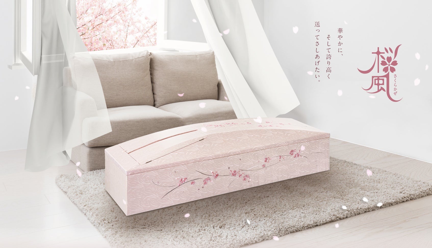 “故人らしい葬儀”を叶えることを目指して開発されたオリジナル棺です。従来の棺は中性的なデザインが主流である中、桜風は「散り際の桜」と「人生の儚さ」を重ね、美しく上品な女性の人生を棺に表現しました。流れるような曲線を取り入れた形状は、水や風といった自然の流れや、季節の移り変わりを表しています。また、仏衣や骨壺も同じテイストのものもご用意しております。