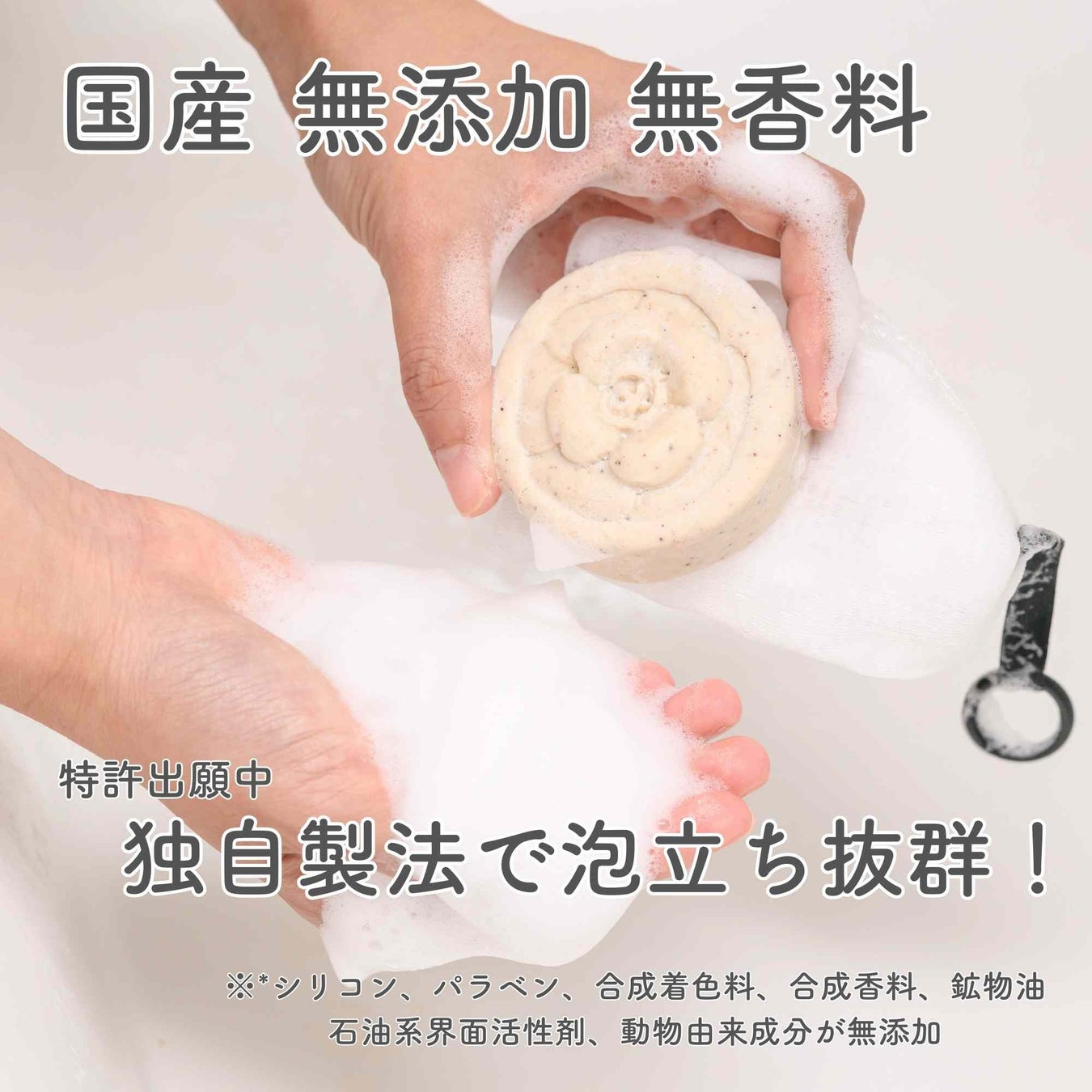 東京都利島のヤブツバキの種をアップサイクルして配合、国内工場で手作業製造。日本伝統の知恵と素材を活かした持続可能な製品づくりを実現。