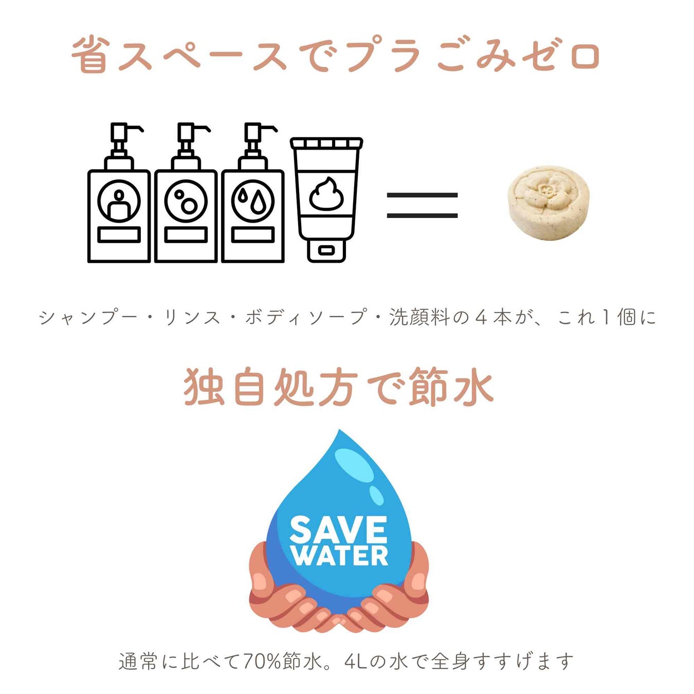 シャンプー、ボディソープ、洗顔料のボトルが不要になり、プラスチックごみゼロ。