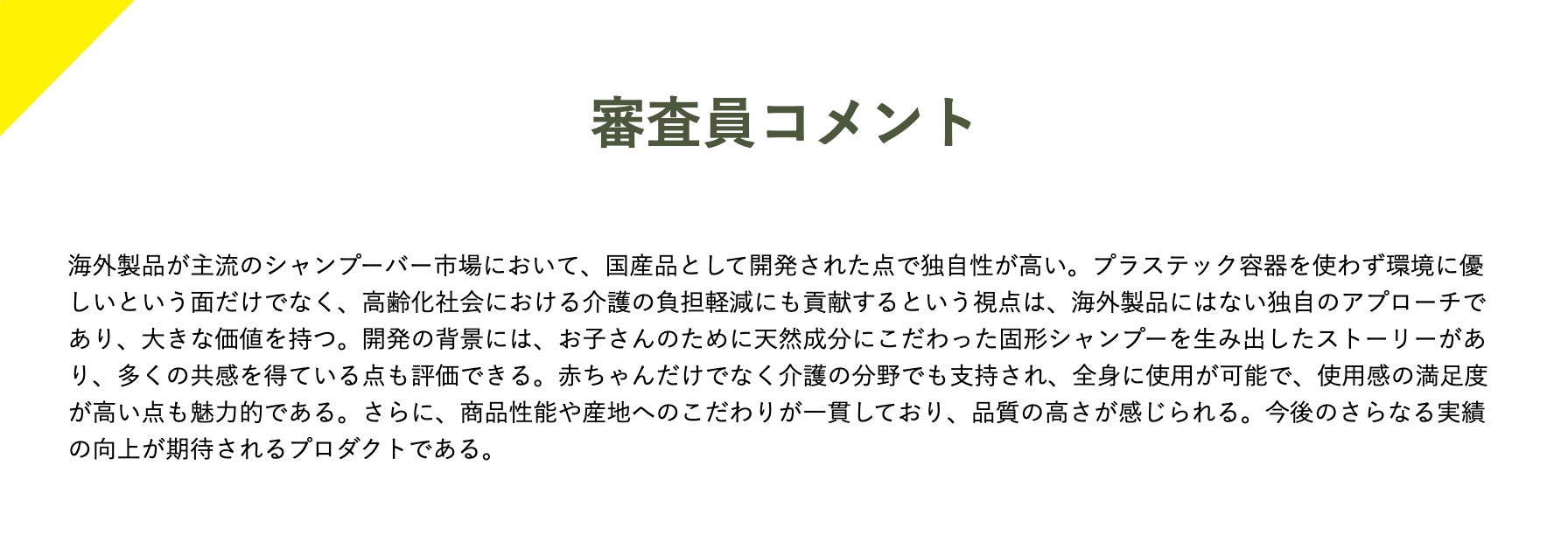「TANE全身シャンプーバー」は、環境・社会に配慮した製品として高く評価され、以下の点で優れたプロダクトと認められました。