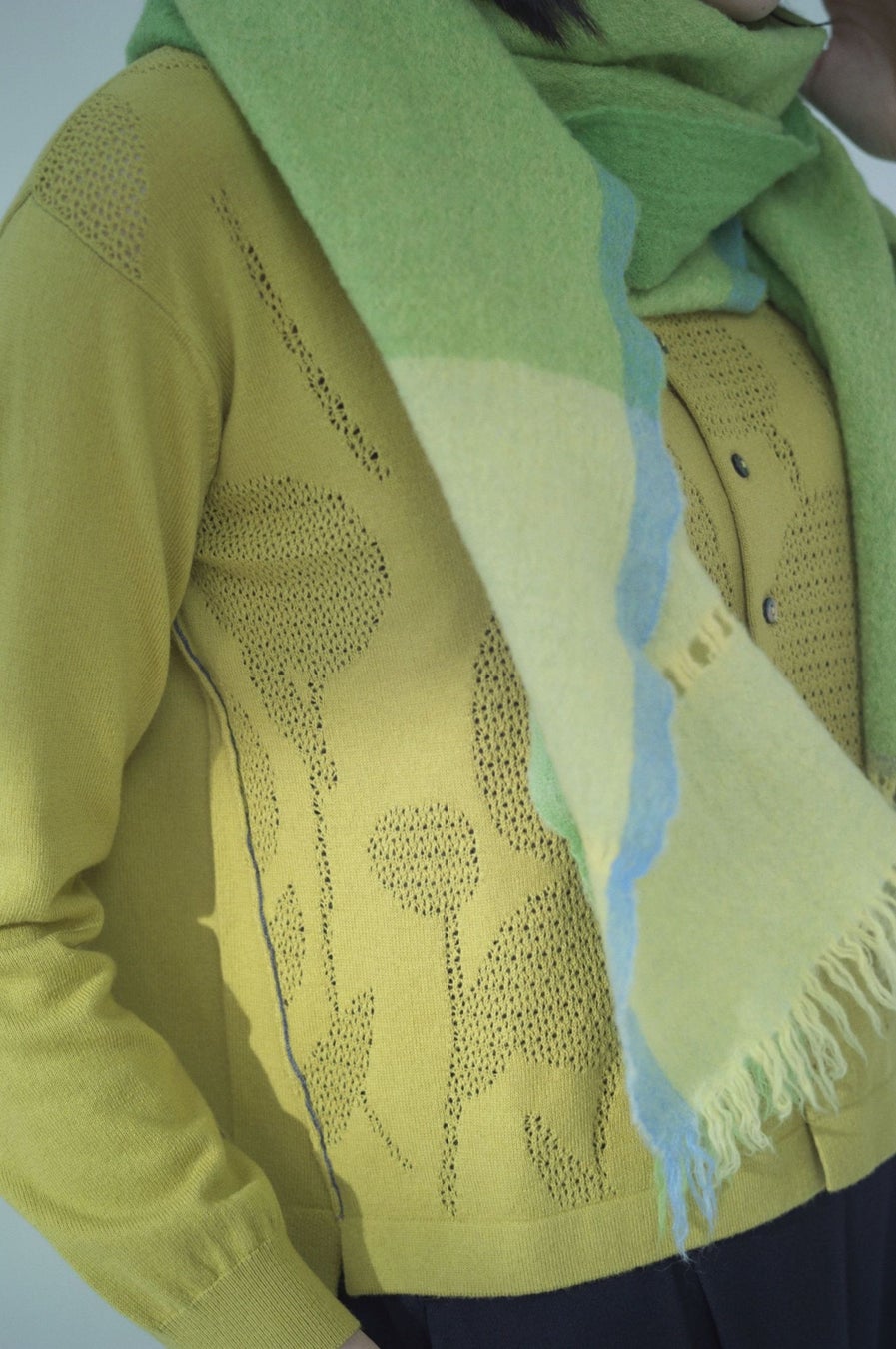 店頭に並ぶ商品には個体差のない均一さが求められます。「個体差がある」とされるものでも、誤差程度であるのが通例です。しかしこのウール縮絨ストールは、広げて並べると一目瞭然。きわの波うち具合や、大きさに至るまで、明らかに個体差が存在します。それらの差を、パラスパレスでは味わいと捉え、色の組みあわせや配色のバランスを変えて毎年リリースしています。