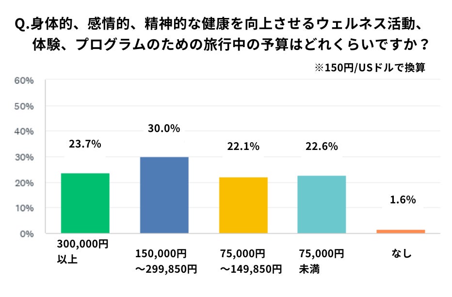 さらに、日本旅行にかけるウェルネス関連の予算も、半数以上の回答者が15万円以上を設定しており、旅行者がかなりの金額をウェルネス活動に投資していることがわかりました。