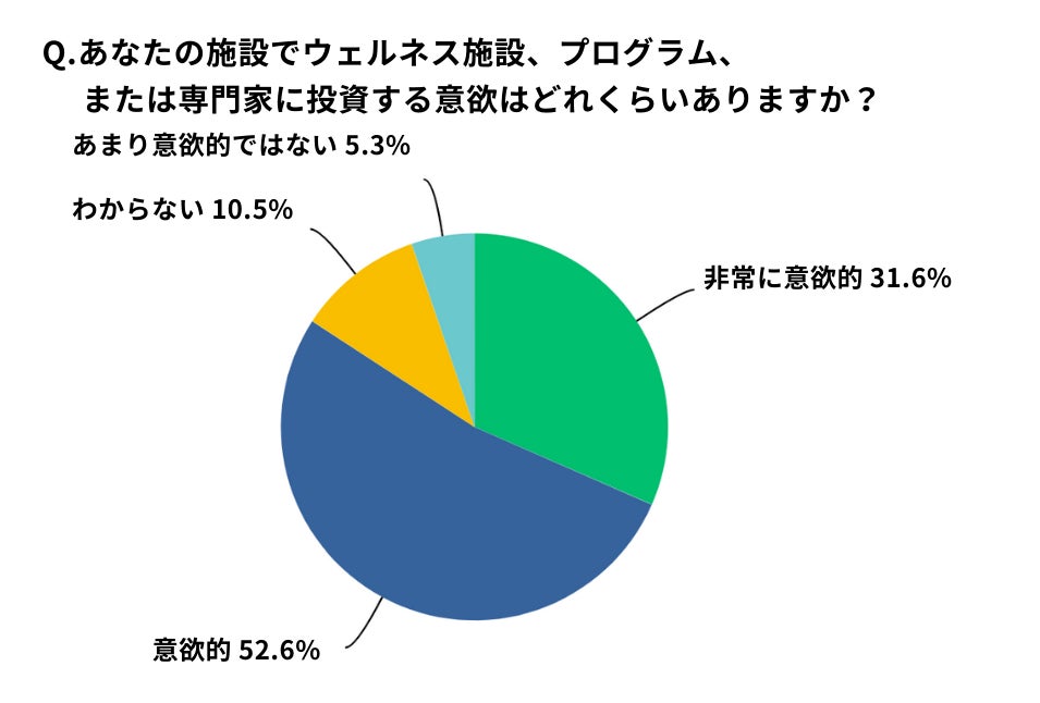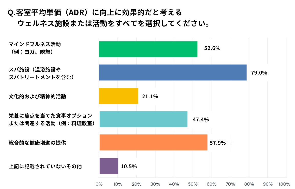 今回のアンケート結果より、多くのホテルがウェルネス施設やプログラムへの投資に対して前向きであることが分かります。特に、約84.2%の回答者が投資に対して肯定的な姿勢を示しており、これは日本市場におけるウェルネスの重要性を示唆しています。海外でここまで投資意欲が高い理由は、経営層がウェルネスへのニーズを重要視しており、顧客満足度の向上、客室平均単価(ADR)向上といったリターンや効果が十分に期待できると考えているからです。また、「どのようなウェルネス施設やアクティビティが客室平均単価(ADR)を向上させる上で効果的と考えるか」という問いに対し、最も期待をされているのはスパ施設ということがわかりました。マインドフルネスや栄養重視の食事プログラムといった個別の体験も効果が高いとされていますが、それらを組み合わせた総合的な健康増進の提供の方が、特に高い効果が期待されています。これらの結果から、ウェルネス施設やサービスの提供者は、多様なニーズに対応するために、様々な種類のウェルネスアクティビティを提供することが推奨されます。
