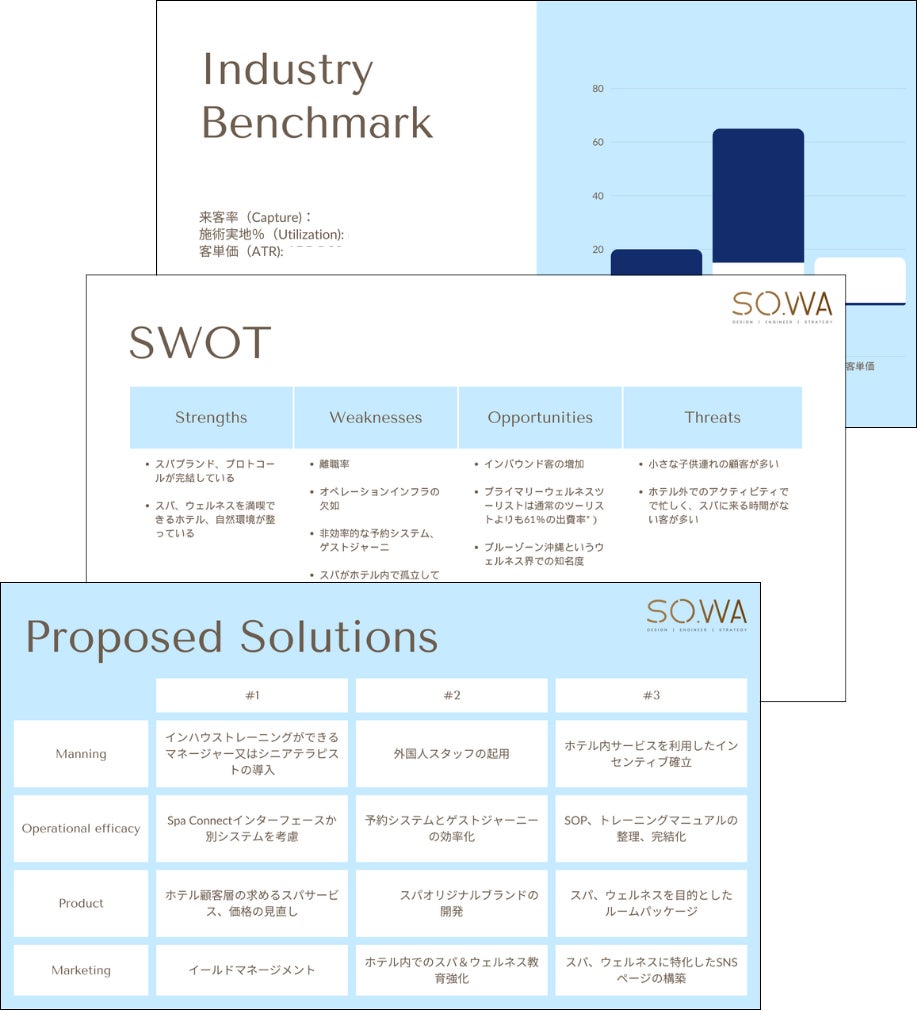 高級ホテルやスパでも、売上が伸び悩むケースが少なくありません。その多くは、長年のスパ運営の経験を積んだスペシャリストが不足していることが原因です。当社は、スパ・ウェルネスに特化した経営戦略やスパ施術のスペシャリストによる総括的なサポートを提供し、数々の実績を上げてまいりました。当社のアプローチは、包括的な運営診断により現状の運営体制やサービスの質を詳細に分析し、業界のベンチマークに基づいて改善点を徹底的に洗い出します。次に、施設の特性やニーズに応じたカスタマイズされたサポートプランを提供し、短期・長期の視点で具体的な改善を促進します。さらに、ブランド価値の向上を図り、良質なインバウンド顧客の集客にも力を入れています。特に、インバウンド対応が可能な専門性の高いスタッフの育成を通じて、国際的な競争力を強化します。このような専門的な支援を通じて、持続可能な成長を実現しています。