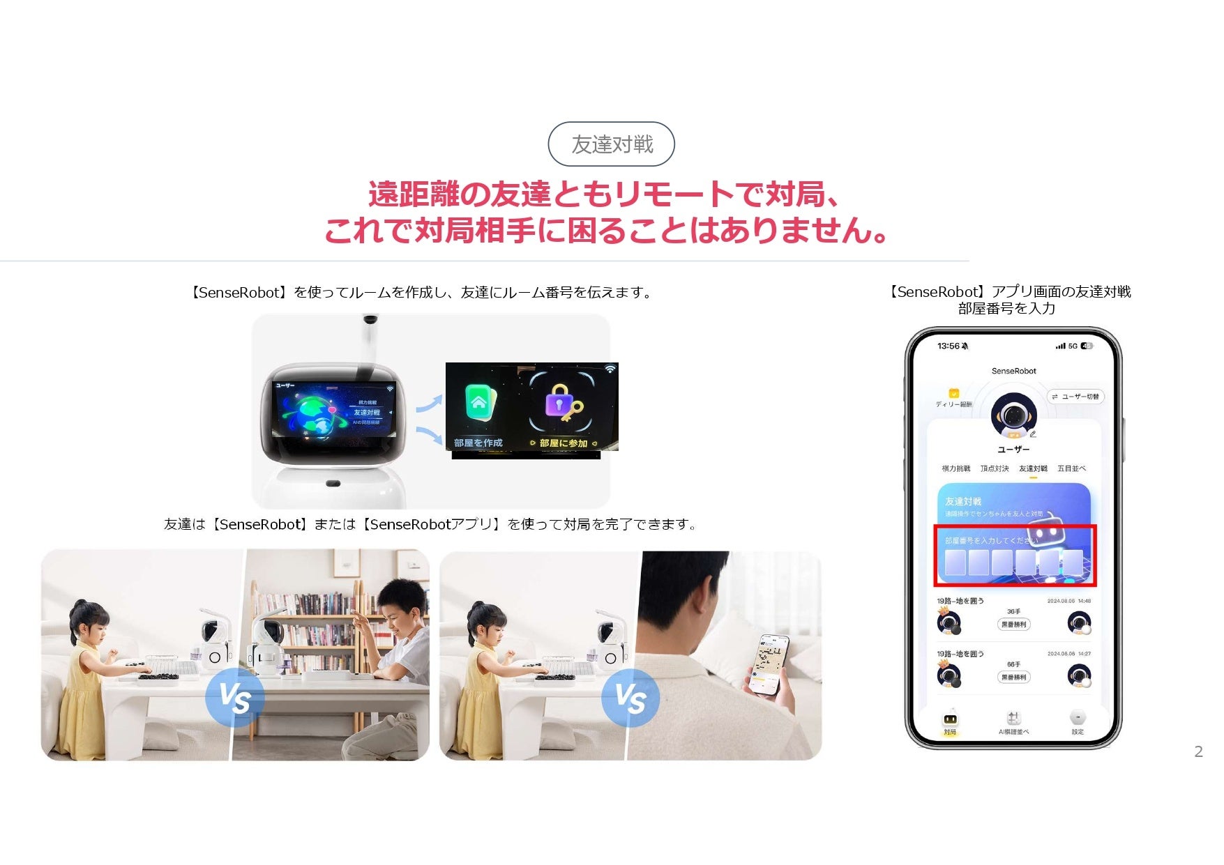SenseRobot同士、またはSenseRobotとSenseRobotアプリを使ってオンラインで対局が可能。
