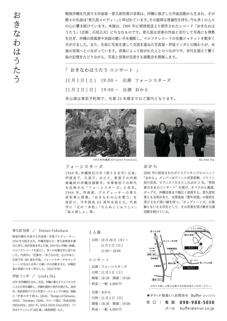 普久原恒勇の音楽と写真の呼応をテーマとした「おきなわはうたう」。普久原恒勇没後、初の実現に至った本企画では「フォーシスターズ」とボイスユニット「おから」が出演するコンサートを開催。