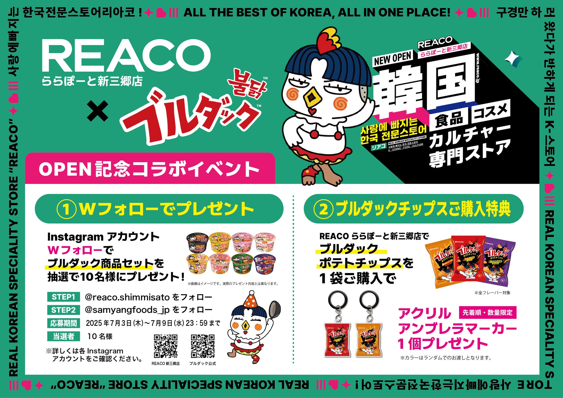 7月3日(木)~7月9日(水)までにREACO ららぽーと新三郷店&韓国人気袋麺ブランド、ブルダックの公式Instagramアカウントをフォローしていただいた方の中から抽選で10名様にブルダック商品セットをプレゼントします。