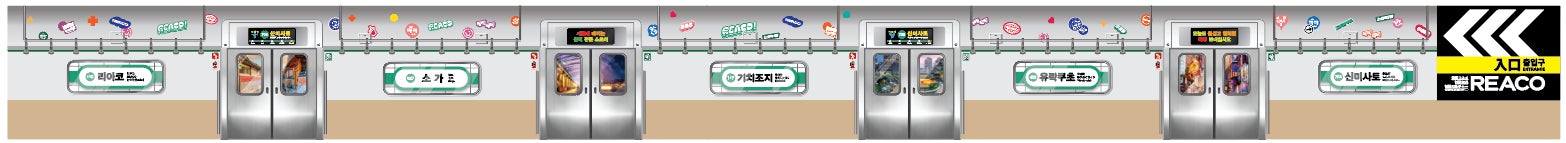 また約30m超えの横長の形状を活かした設計で、通路側の壁には韓国の地下鉄を再現したパノラマウォールを設置します。コーポレートカラーの緑を基調としたポップな雰囲気の店内で、韓国カルチャーの魅力を存分にお楽しみください。