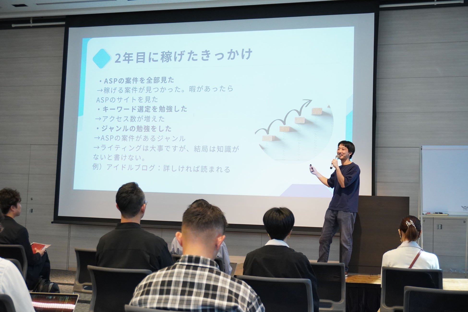 その後、2年目に稼げるようになった理由として「ASPの案件を全部見たこと」「キーワード選定を勉強したこと」「ジャンルごとの勉強をしたこと」をあげ、記事を書かなかったのが正解だったと回顧。これまでブログで稼いでいる人を数多く見てきたという竹中氏は「とにかくジャンルに詳しいことが稼いでいる人の共通点でした」と見解を述べました。