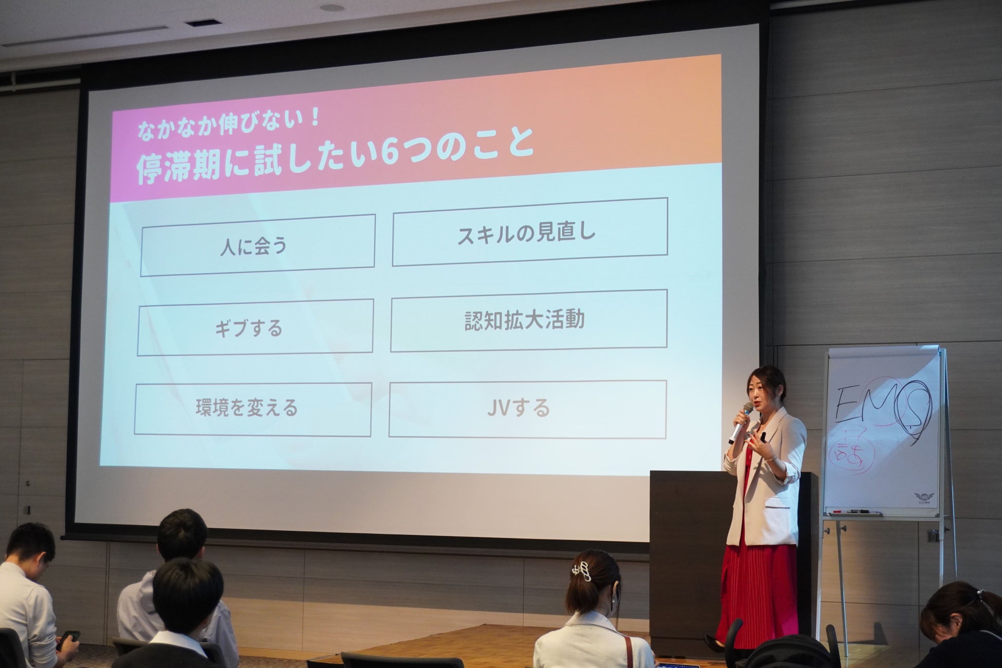 行動を起こすには「心から達成したいと思えるゴール」「ヒリヒリする期日」「ロールモデル」を持つことだとし、何者でもなかった自分でも会社経営やサロン運営をできている自身の等身大を伝えることで、参加者が前を向けるような講演となりました。