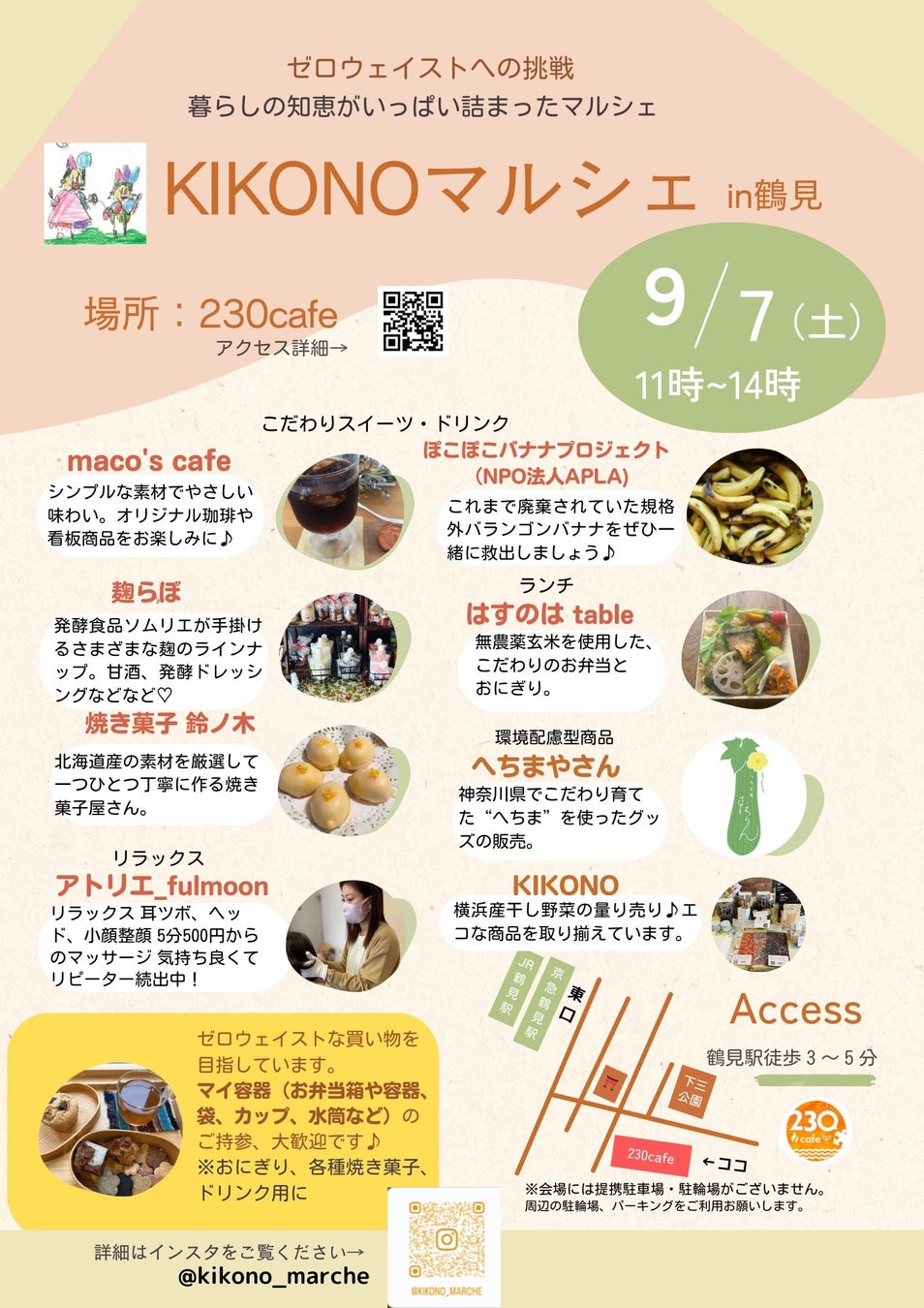 今回で4回目となる「KIKONOマルシェ」は、無駄や浪費をなくして、ごみを出さない取組み「ゼロウェイスト」の推進を目指して企画されているマルシェです。「ぽこぽこバナナプロジェクト」のほか、へちまたわしや、農薬玄米を使用した弁当、横浜産干し野菜の量り売りなど8ブースが出店予定。ゴミを出さない、ゼロウェイストな買い物を体験してもらうため、マイ容器(お弁当箱や容器、袋、カップ、水筒など)の持参を呼びかけ開催されます。