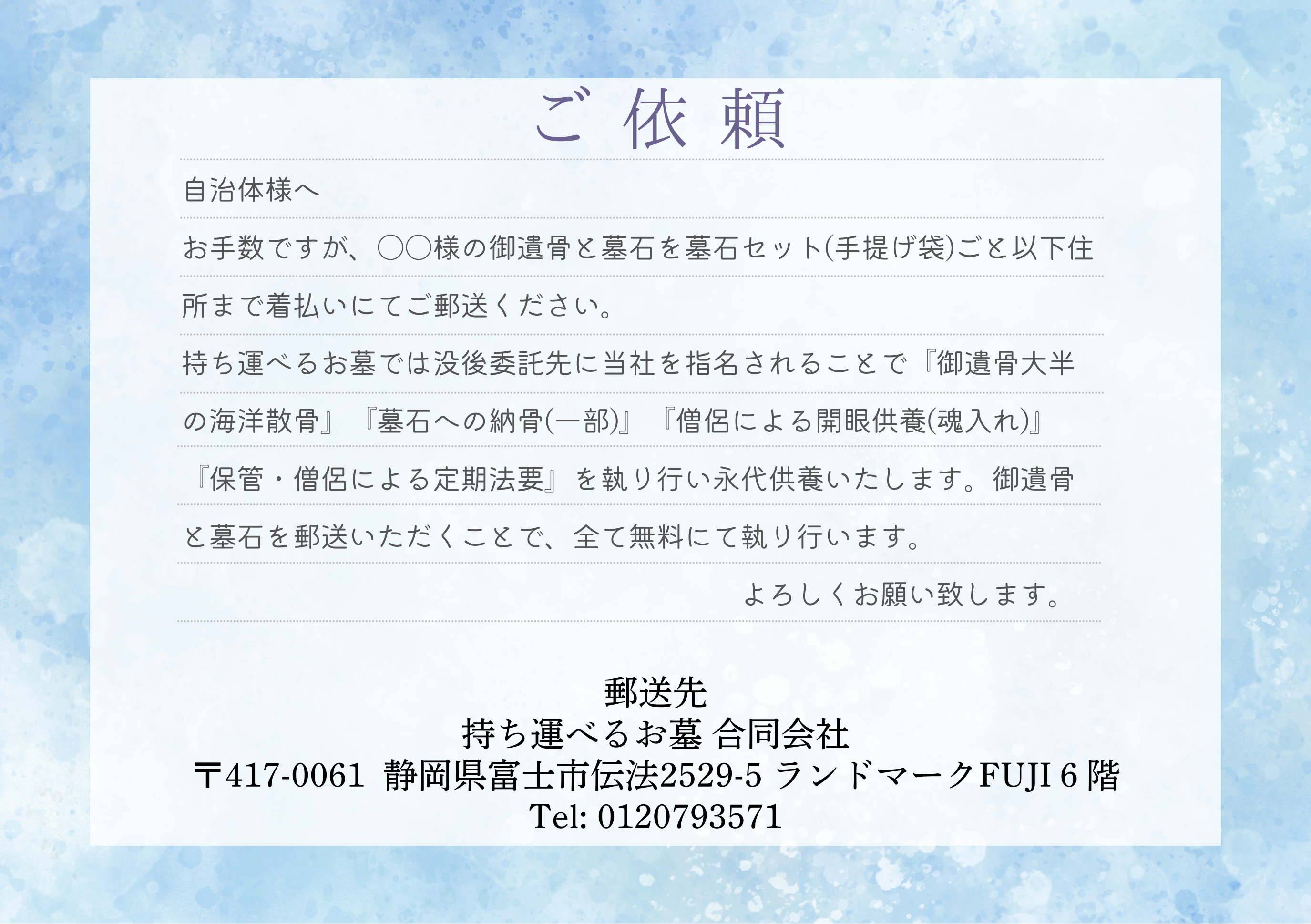 また、当社を没後委託者に指名することで、自治体から直接当社へ御遺骨と墓石を郵送いただく仕組みです。