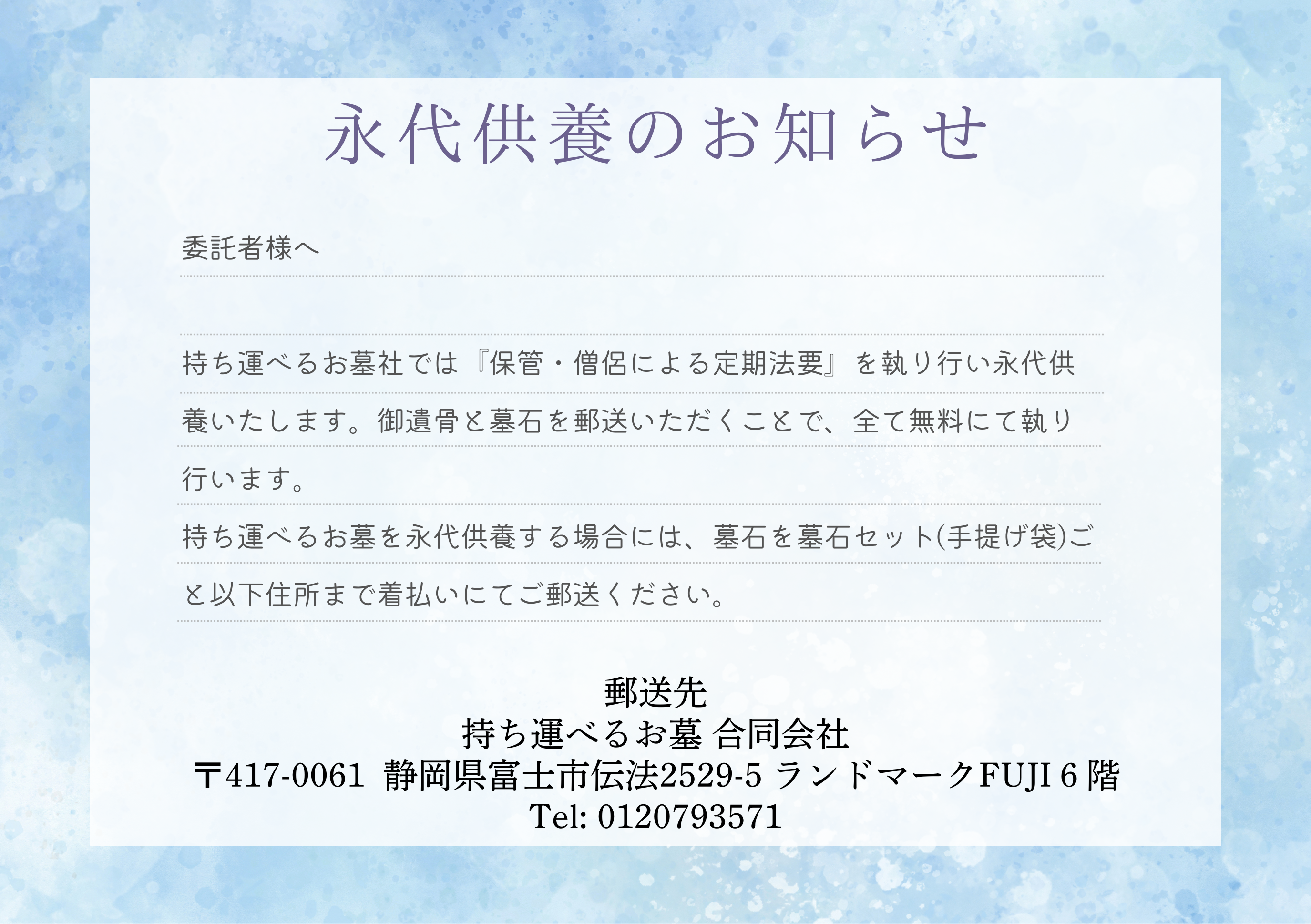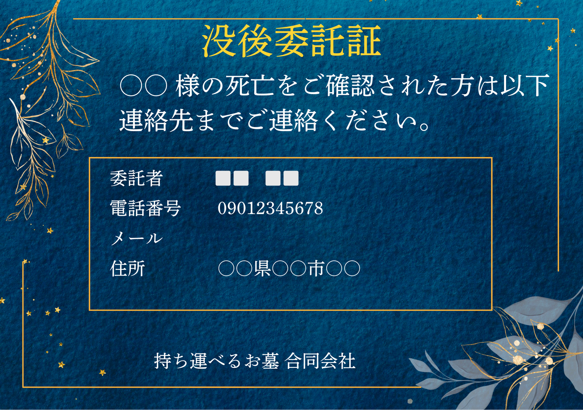 持ち墓セットの中に『没後委託証』というものがあります。この用紙には没後委託者の連絡先と、発見者からの連絡依頼の旨が記されています。これにより、知らぬ間に火葬されてしまう悲劇(参照:クローズアップ現代「知らない間に火葬された“あふれる遺体”相次ぐトラブルの実態」/2024年6月10日放送)を防ぎます。