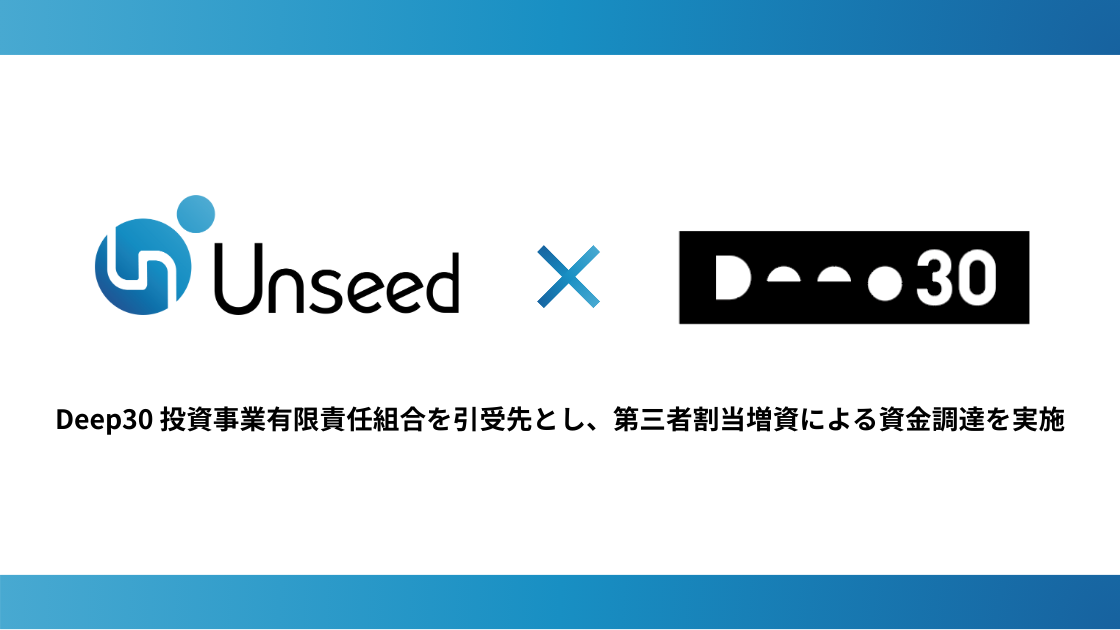 株式会社Unseedは、Deep30 投資事業有限責任組合を引受先とし、第三者割当増資による資金調達を実施しました。