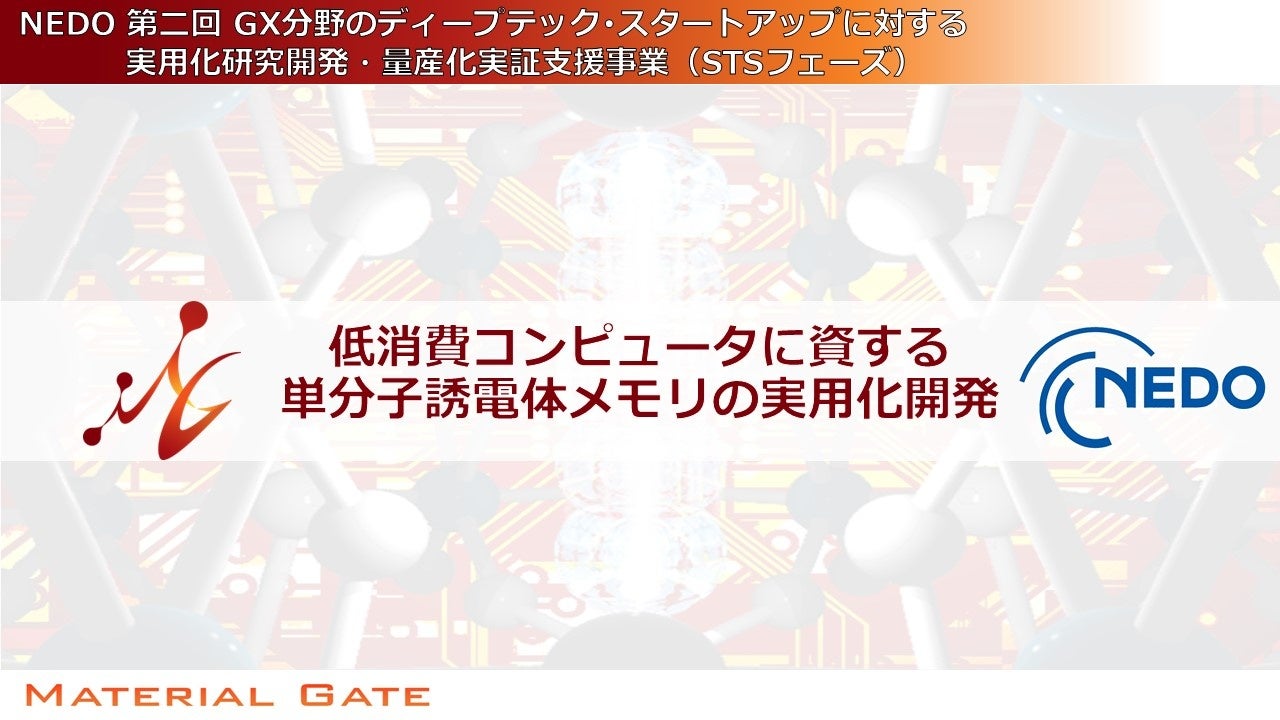 広島大学発のスタートアップであり、新規機能性材料『単分子誘電体』を用いた低消費電力メモリの実現を目指す株式会社マテリアルゲート(広島県、代表取締役:中野佑紀)は、国立研究開発法人 新エネルギー・産業技術総合開発機構(以下、NEDO)の「GX 分野のディープテック・スタートアップに対する実用化研究開発・量産化実証支援事業(以下、GX)」の第2回公募において、STS(Seed-stage Technology-based Startups)フェーズに採択されたことをお知らせします。