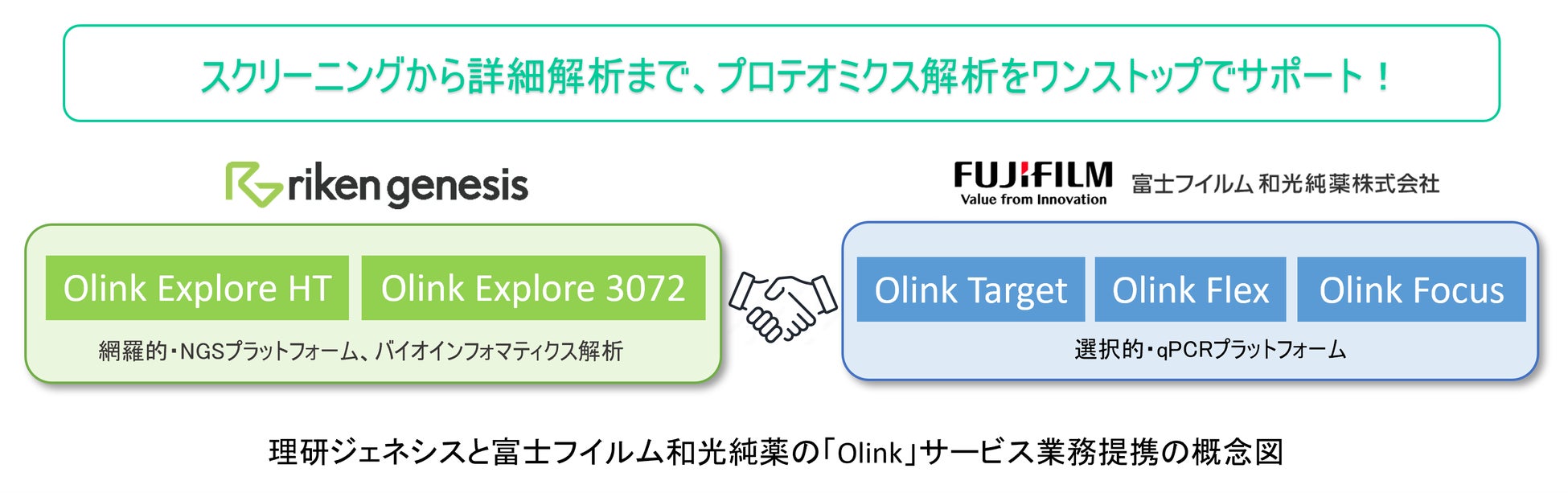株式会社理研ジェネシス(本社:東京都品川区、代表取締役社長:岩壁 賢治、以下「理研ジェネシス」)は、オーリンクプロテオミクス株式会社の高感度プロテオーム解析「Olink™*1」のワンストップサービスの提供を目的に、富士フイルム和光純薬株式会社(本社:大阪市中央区、代表取締役社長:吉田 光一、以下「富士フイルム和光純薬」)と業務提携しましたことをお知らせします。