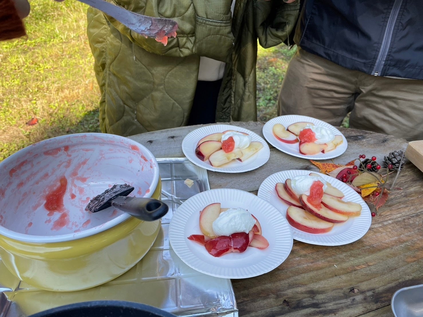収穫したばかりのりんごを使って、青空の下で手作りのりんごのスイーツ作りに挑戦!