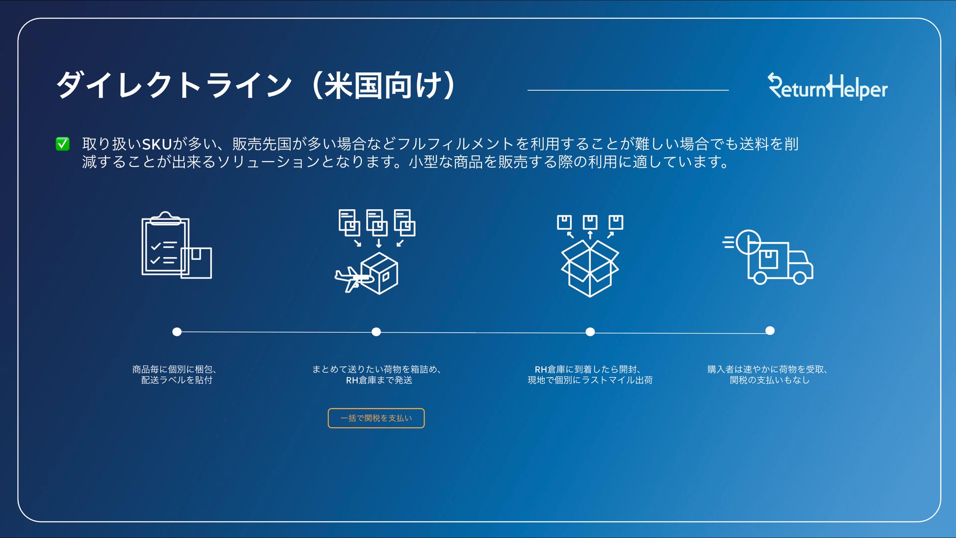 Return Helper(リターンヘルパー)は、越境ECの返品に関するコストと手間を大きく削減できる、ワンストップグローバルEC返品ソリューションです。世界各国に倉庫や拠点を持ち、物流業者と連携することで、高額な送料や複雑な通関手続きなどの返品時の課題を解決します。