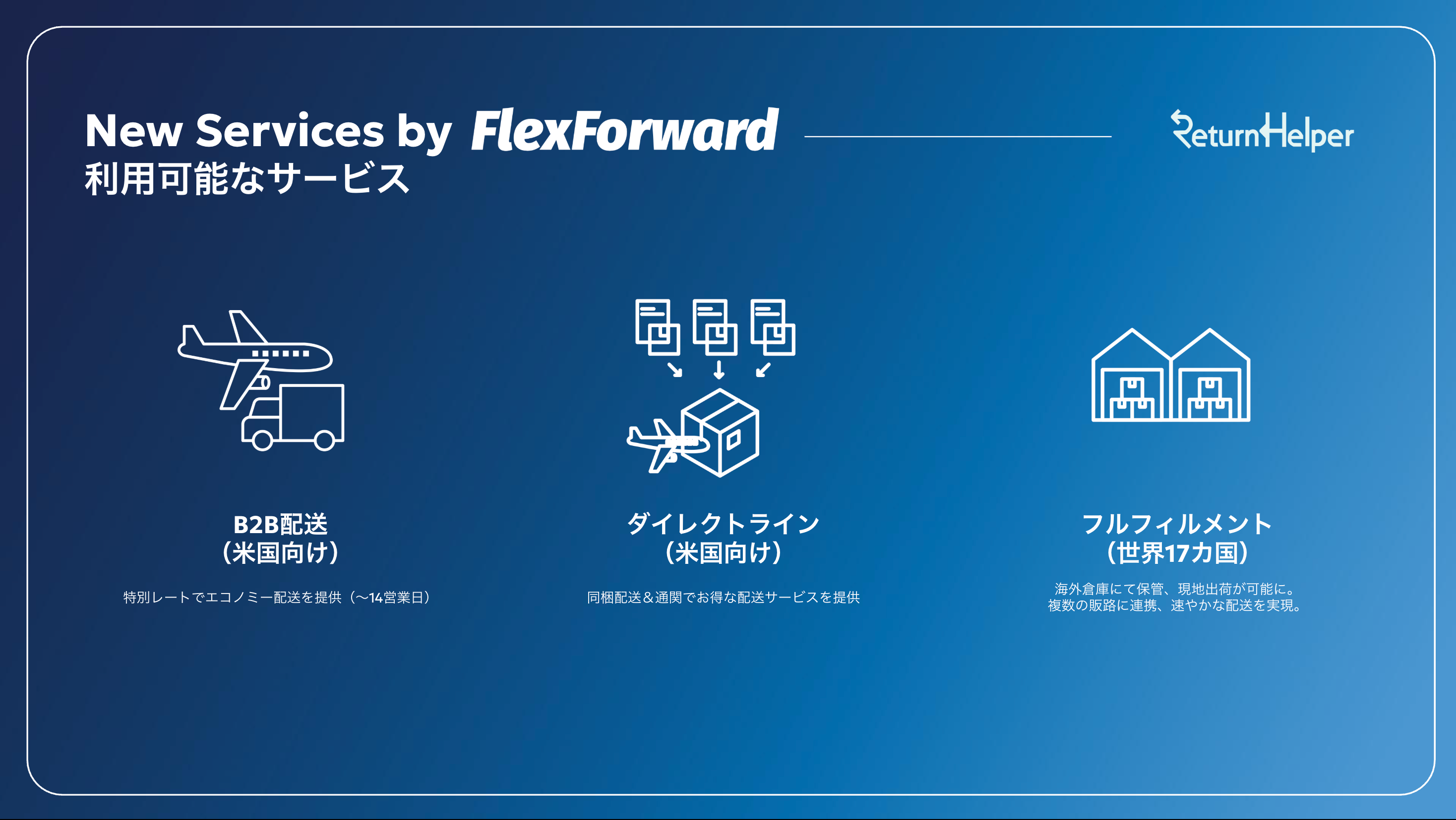 越境EC向けの物流サービスを提供するReturn Helper株式会社(本社:東京都新宿区、代表取締役:柴田 駿平、以下リターンヘルパー)は、国際物流サービス「FlexForward」の新機能として、ダイレクトラインをリリースいたします。