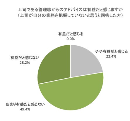 同様に、自身の業務を把握していない上司とのコミュニケーションを有益だと感じるかという質問をしたところ、「有益だと感じない(24.7%)」「あまり有益だと感じない(49.4%)」という結果となりました。さらに、上司からのアドバイスを有益だと感じるか聞いたところ、「有益だと感じない(28.2%)」「あまり有益だと感じない(49.4%)」という結果となりました。