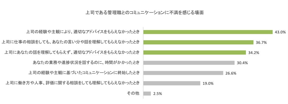 上司である管理職とのコミュニケーションに不満を感じるのは、「上司の経験や主観により、適切なアドバイスをもらえなかったとき」「上司に仕事の相談をしても、言い分や話を理解してもらえなかったとき」「上司に話を理解してもらえず、適切なアドバイスをもらえなかったとき」が上位に