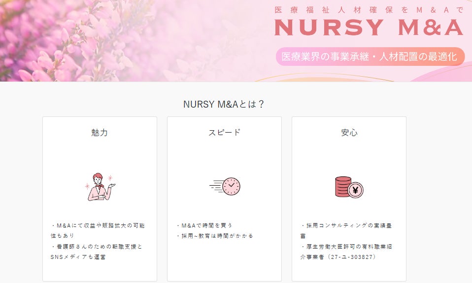 株式会社NURSY(本社:大阪市中央区、代表取締役:福岡 厚志)は、医療機関や介護施設の事業承継を支援する医療・介護業界特化型のM&A事業を新たに開始いたしました。