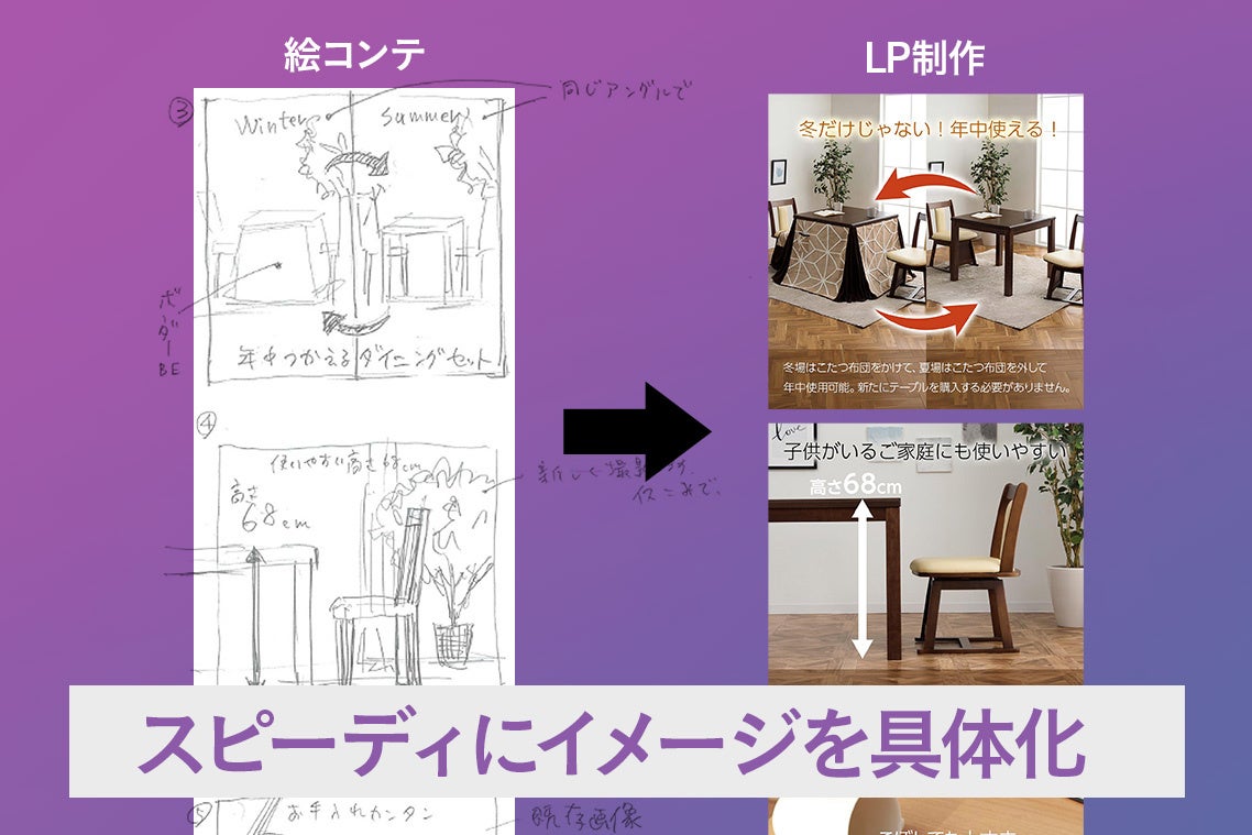 撮影した画像を活用してターゲット顧客に響くデザインを提供します。専属のデザイナーがヒアリングを通じてクライアント企業の要望を把握し、ページの構成やデザインを具体化するための絵コンテを作成。完成イメージを事前に共有することで、クライアント企業とスムーズに調整を行い、短納期で高品質なLPを制作いたします。