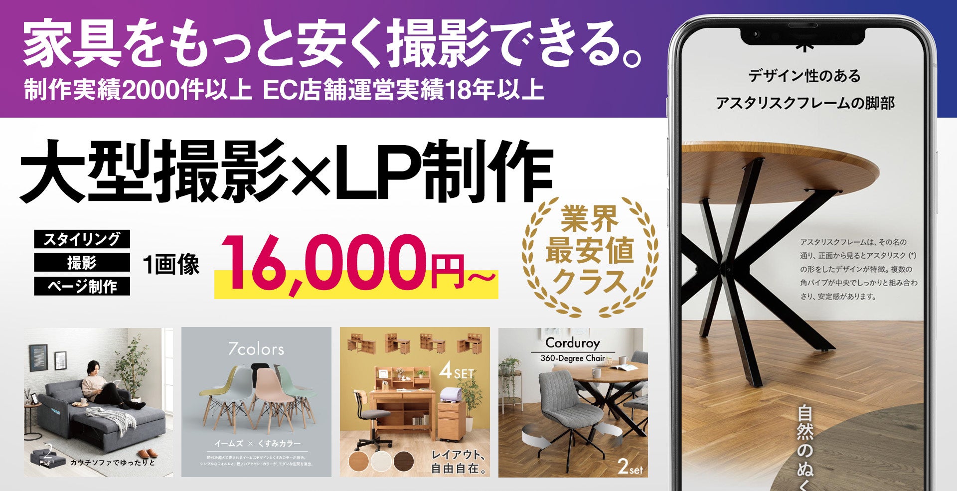 【家具の撮影にお困りのEC事業者必見】大型撮影からLP制作までワンストップ!ECモール系に特化した業界最安値クラスの撮影&制作サービス「PIXAZ」を開始 !