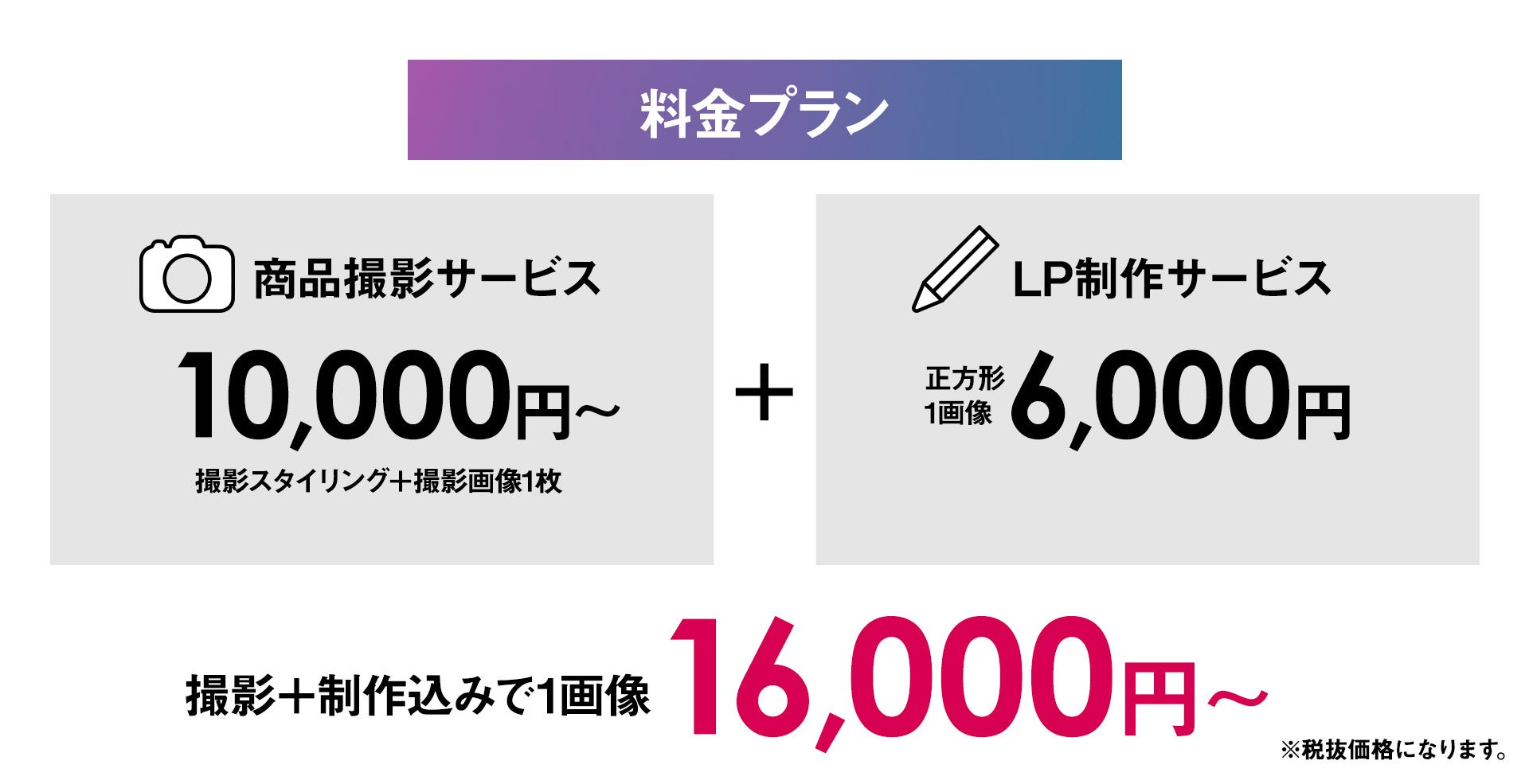 商品撮影とLP制作を業界最安値クラスの価格で提供しています。商品撮影は撮影スタイリング込みで1カット10,000円~、さらに、撮影からLP制作までをセットで依頼する場合は正方形1画像あたり16,000円というリーズナブルな料金体系を実現しました。ECモールに特化し、ページ制作に必要な最低限のクオリティを確保しつつ、無駄なコストを削減しています。