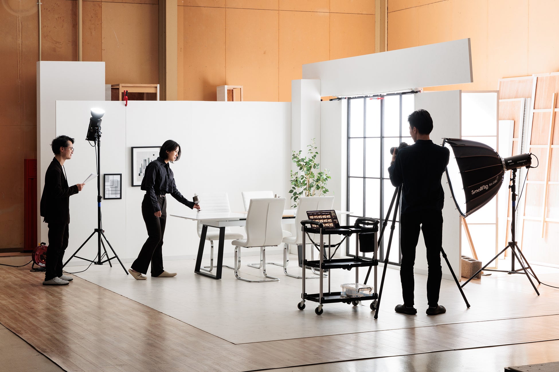 楽天市場やAmazonなどのモールに対応した白背景の撮影はもちろん、セットや小道具を使用したイメージシーン撮影も得意。広大な500㎡以上の撮影スタジオでは、大型家具の撮影も可能で、ソファやダイニングテーブルのような重量のある商品の魅力を最大限に引き出します。また、プロのカメラマンが撮影から色調整まで一貫して対応するため、質の高い画像をスピーディに納品。300㎡以上の専用倉庫を備えているため、商品の保管や搬入もスムーズな対応が可能です。