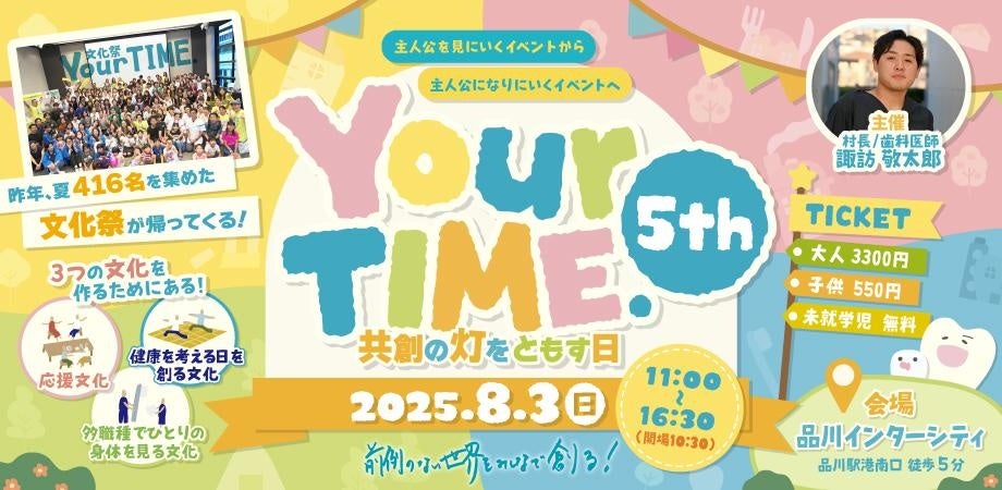 Niw研究会・交流会(代表:歯科医師 諏訪敬太郎)は、2025年8月3日(日)に品川インターシティホールにて、体験型イベント『Your TIME.5th』を開催いたします。医療・教育・福祉などの専門家が集い、子どもも大人も主役になれる“職業体験×文化祭”をコンセプトにした1日限りのイベントです。