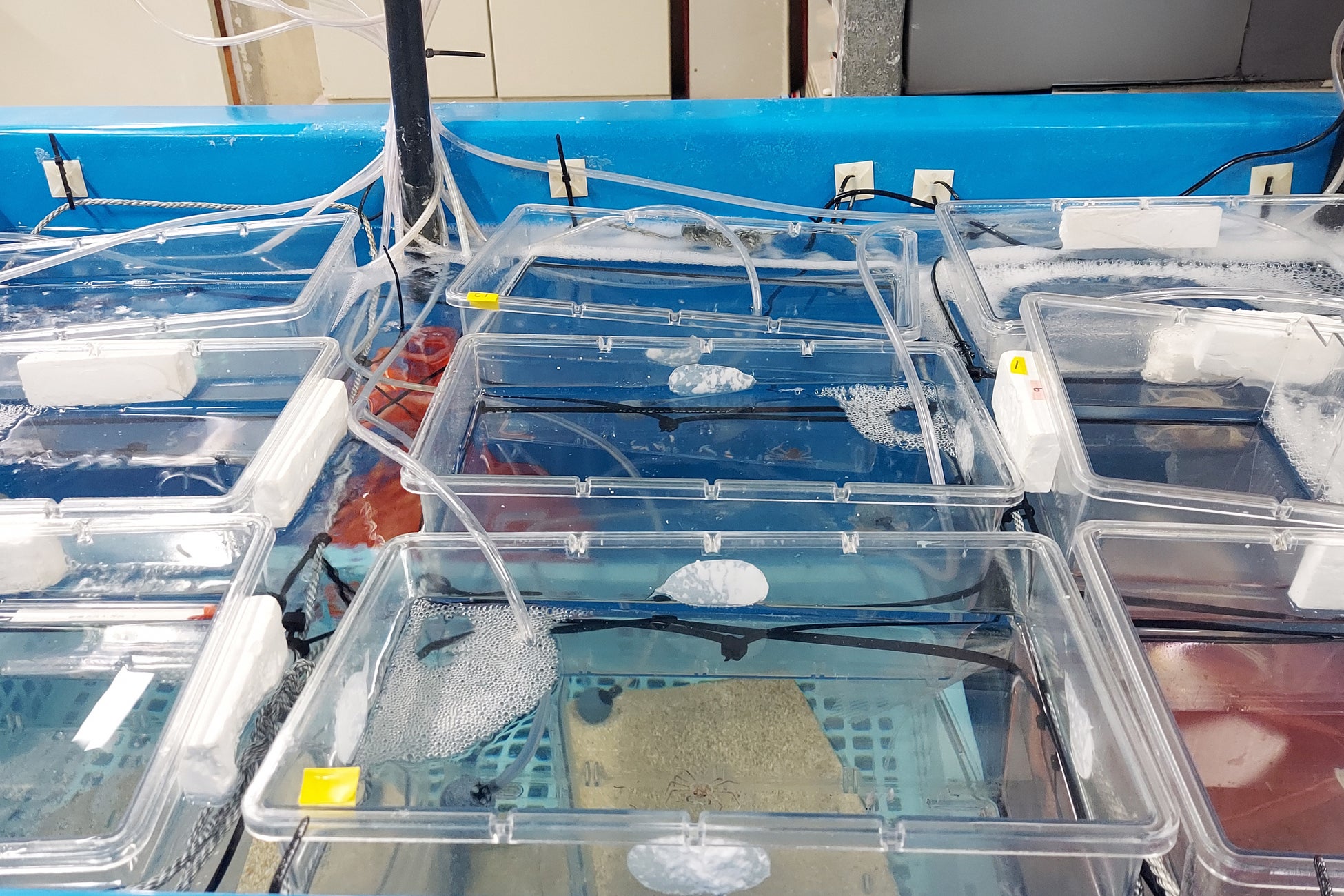 まず取り組んだのは共食いの防止。1匹ずつプラスチックのケースに分けて飼育することとし、その様子はまるで「カニのアパート」。共食いは無くなりましたが、エサやりと掃除は1部屋ごとに手作業で行わなければなりません。チームメンバーを中心に毎日時間をかけて作業し、課題をクリアしていきました。こうして膨大な手間暇をかけ、生存率を高めることに成功します。