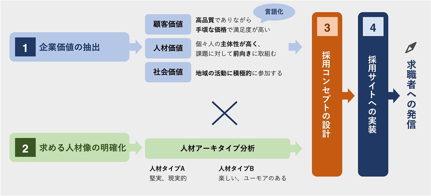 採用戦略の策定と合わせて貴社の価値抽出、求める人材像の明確化をもとに、採用コンセプトを設計し、採用サイトの構築までワンストップで支援します。